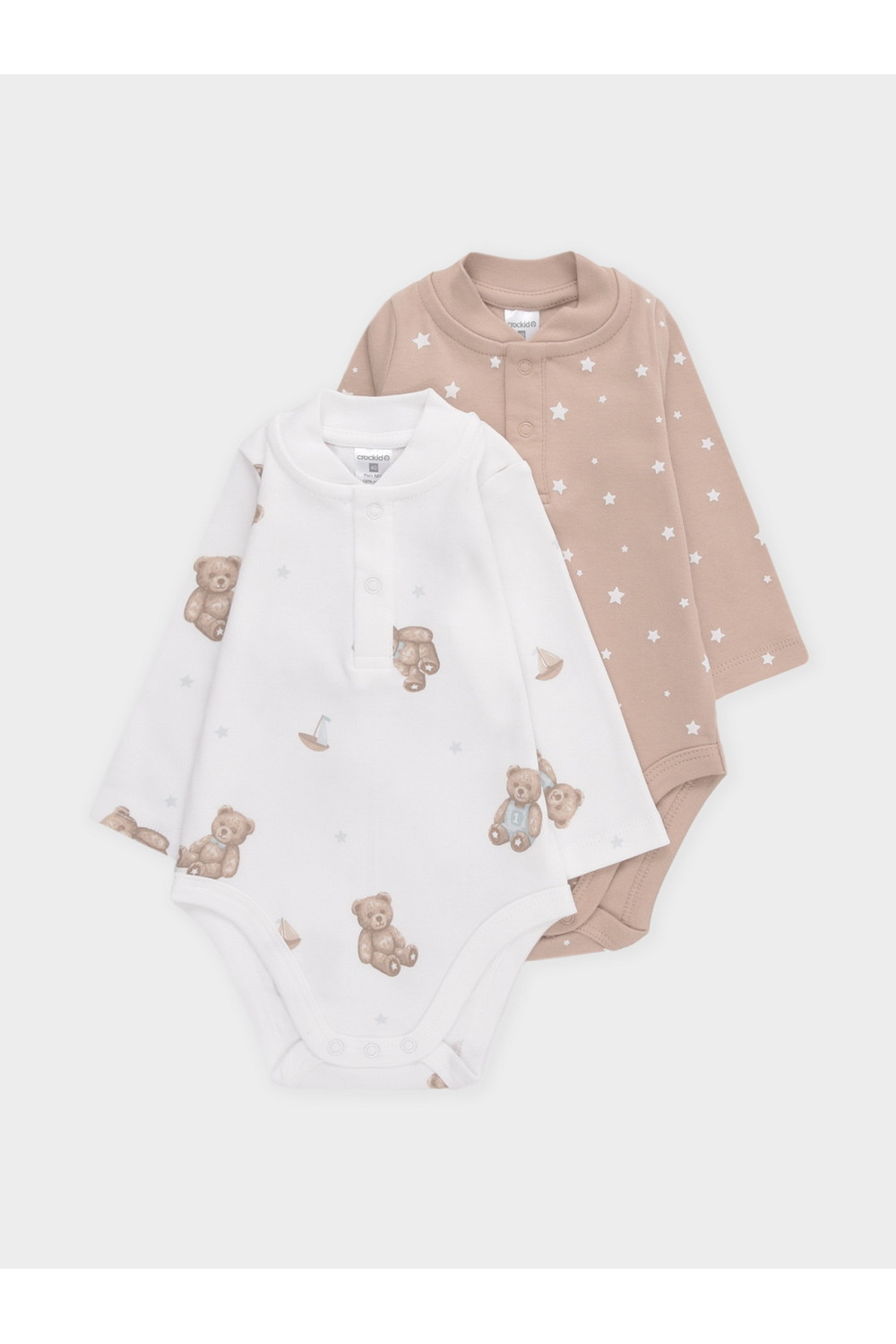 Боди для новорождённых из мягкого эластичного трикотажа, произведённого из натурального хлопка. В упаковке 2 штуки. Застёгиваются на кнопки спереди и по низу изделий. Оригинальная набивка выполнена из стойких гипоаллергенных текстильных красителей. Все трикотажные полотна производятся в соответствии с нормами швейцарского сертификата ЭкоТекс.