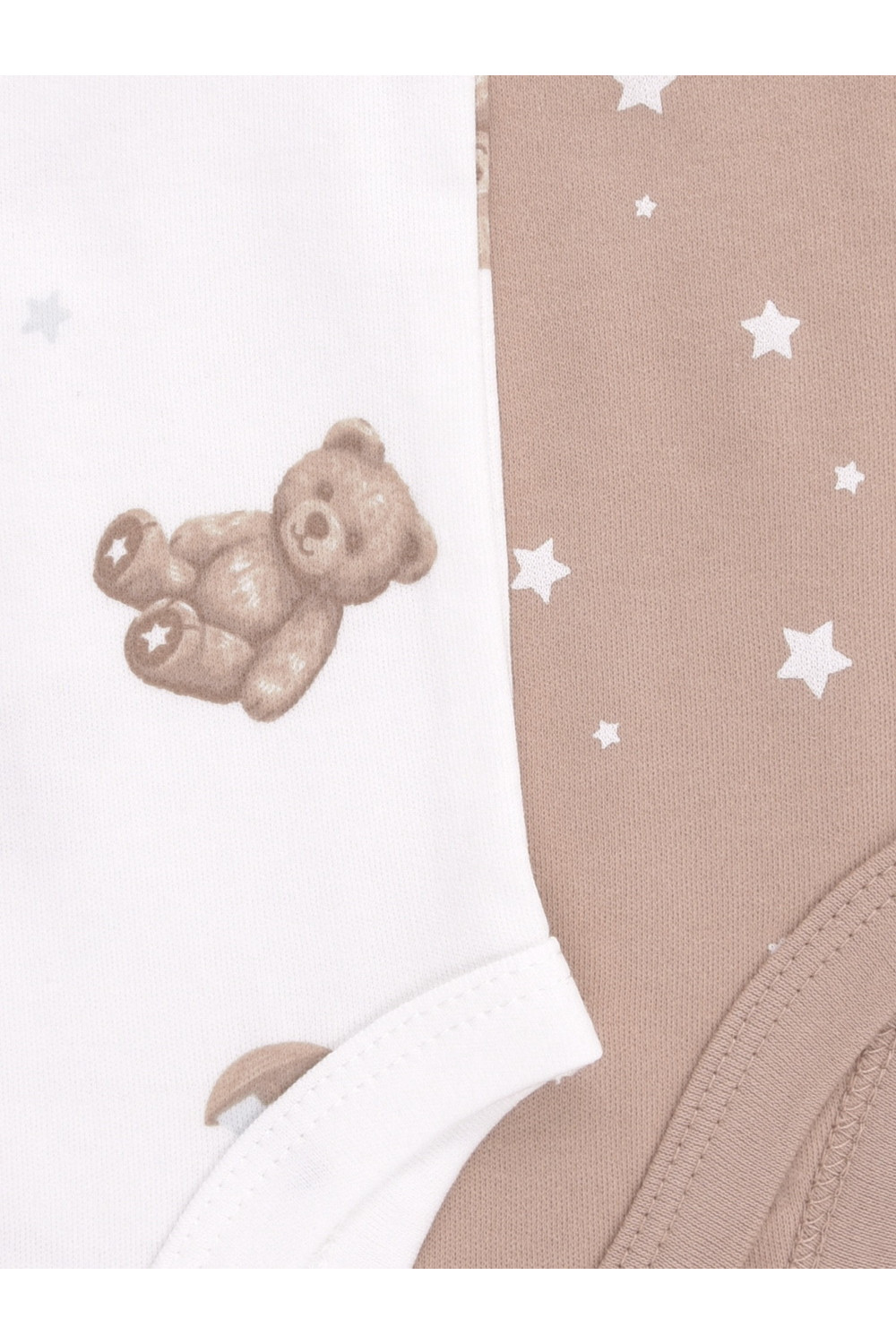 Боди для новорождённых из мягкого эластичного трикотажа, произведённого из натурального хлопка. В упаковке 2 штуки. Застёгиваются на кнопки спереди и по низу изделий. Оригинальная набивка выполнена из стойких гипоаллергенных текстильных красителей. Все трикотажные полотна производятся в соответствии с нормами швейцарского сертификата ЭкоТекс.