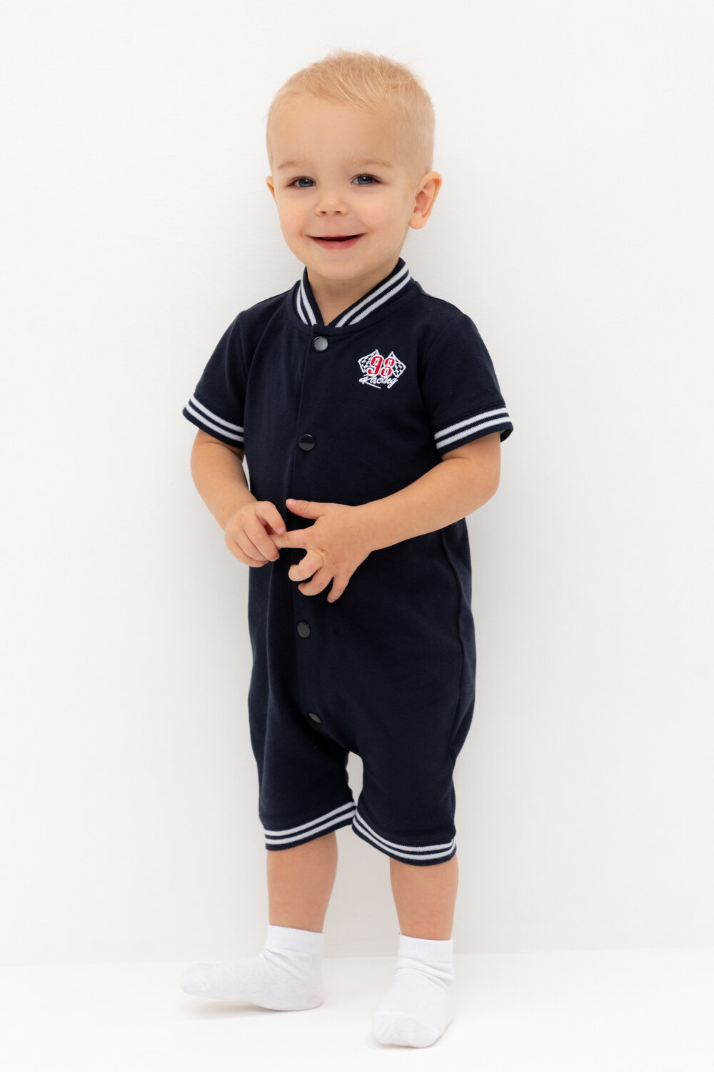 Легкий трикотажный песочник для мальчика из высококачественного хлопка. Застёгивается спереди на кнопки. Украшен вышивкой на груди. Изделие сохраняет цвет и форму после многократных стирок.