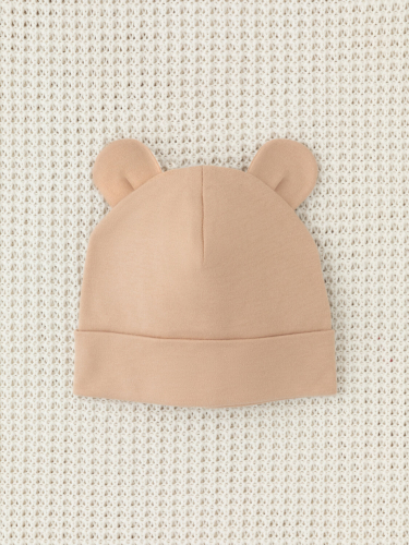 Шапка с отворотом для новорождённых из мягкого эластичного трикотажа интерлок, произведённого из натурального хлопка. Украшена декоративными ушками. Все трикотажные полотна производятся в соответствии с нормами Швейцарского сертификата ЭкоТекс.