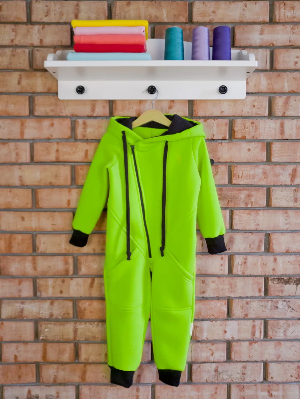 Модель оснащена удобной косой молнией, которая позволяет быстро и легко одевать ребёнка, не причиняя дискомфорта. Комбинезон плотно сидит на теле, но не стесняет движений благодаря свободному крою и эластичным манжетам на рукавах и штанинах. Капюшон надёжно защищает голову малыша от ветра и создаёт дополнительный уют.
