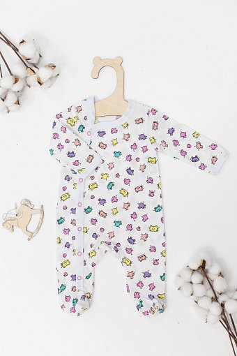 Комбинезончик для девочек выполнен из 100% хлопковой ткани с набивным рисунком. С длинными рукавами под бейку и удобной смещённой застежкой на кнопках по всей длине изделия.