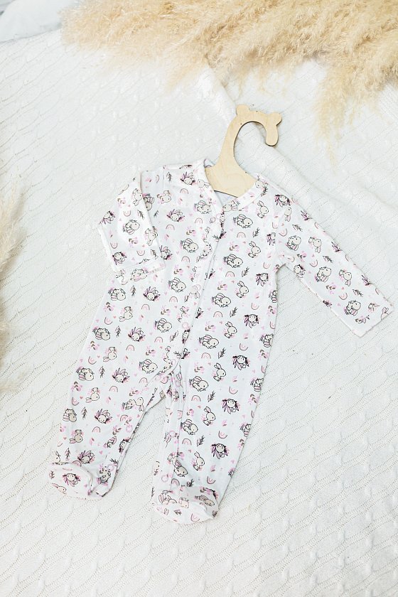 Комбинезон для новорожденных из интерлока в цвете экрю с набивным рисунком в виде зайчиков - милый и практичный выбор для вашего малыша.