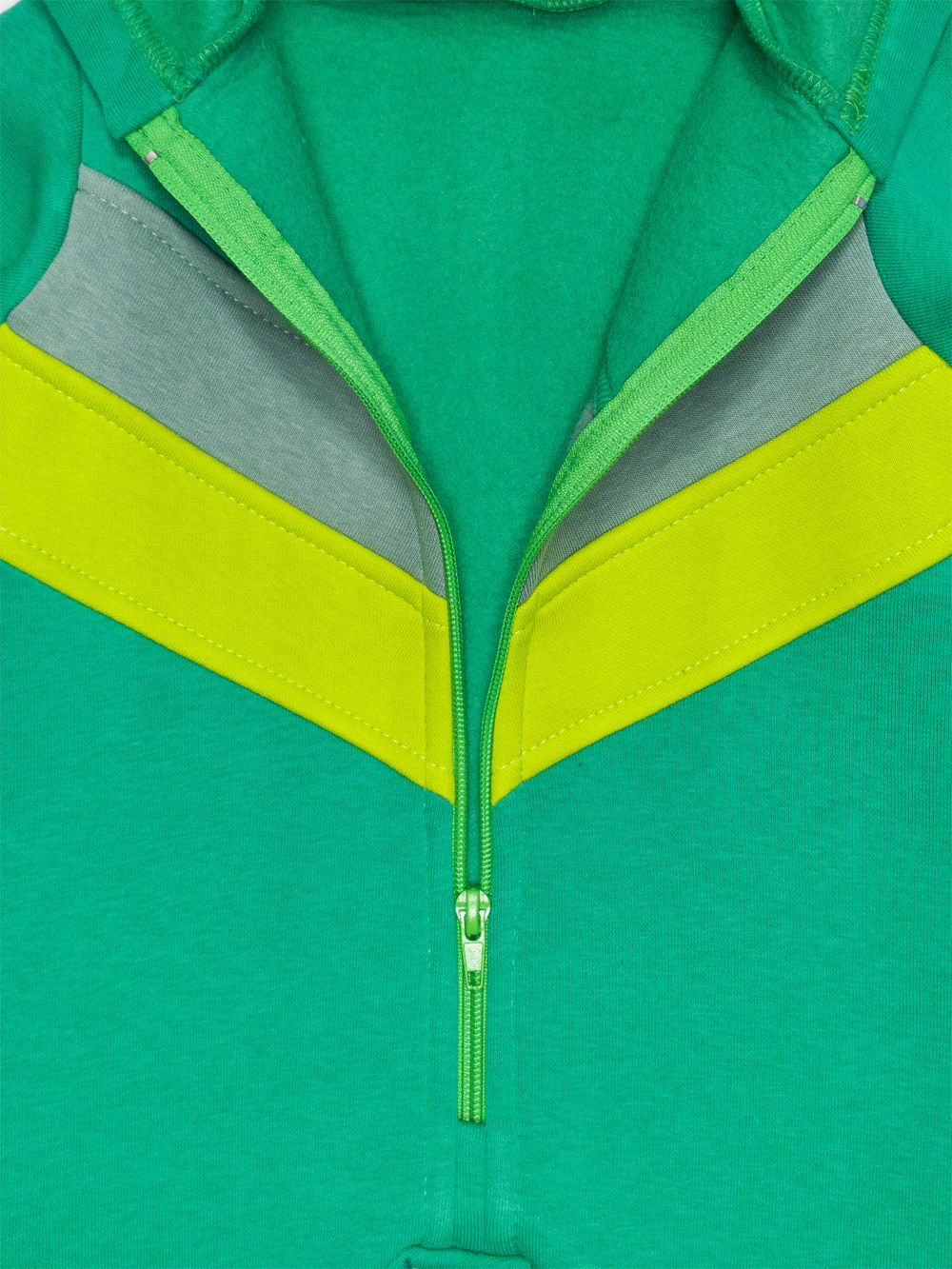 Стильный, уютный и очень теплый комбинезон для малыша. Длинный втачной рукав. Горловина обработана капюшоном. Спереди по всей длине -  застежка-молния. Рукава обработаны манжетами из кашкорсе. Открытый след. Изделие выполнено из плотного футера трехнитки с начесом, украшено контрастными вставками. В таком комбинезоне Ваш малыш всегда будет в центре внимания. Футер 3-нитка с начесом, 70% хлопок + 30% п/э