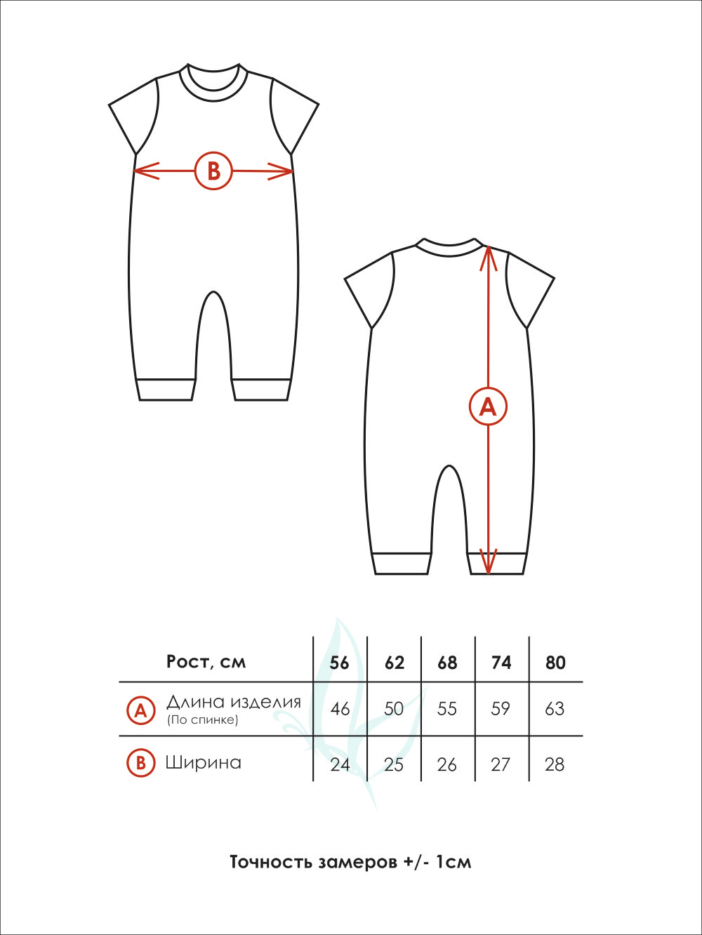 Изумительный комбинезон для Вашего малыша.  Короткий втачной рукав. Горловина обработана воротником. Спереди по всей длине и между ножек – застежки-кнопочки. Открытый след.  Изделие выполнено из мягкого интерлока, декорировано бабочкой. В таком комбинезоне Ваш маленький модник всегда будет в центре внимания. Интерлок, 100% хлопок