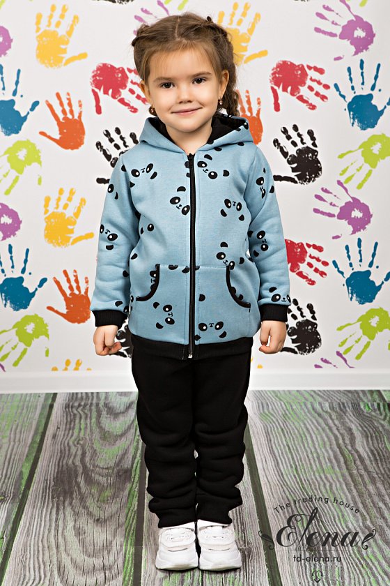 Детский костюм выполнен из полотна с начёсом. Толстовка с капюшоном и застёжкой на молнию, по бокам расположены карманы. Брюки на манжете, пояс на резине.