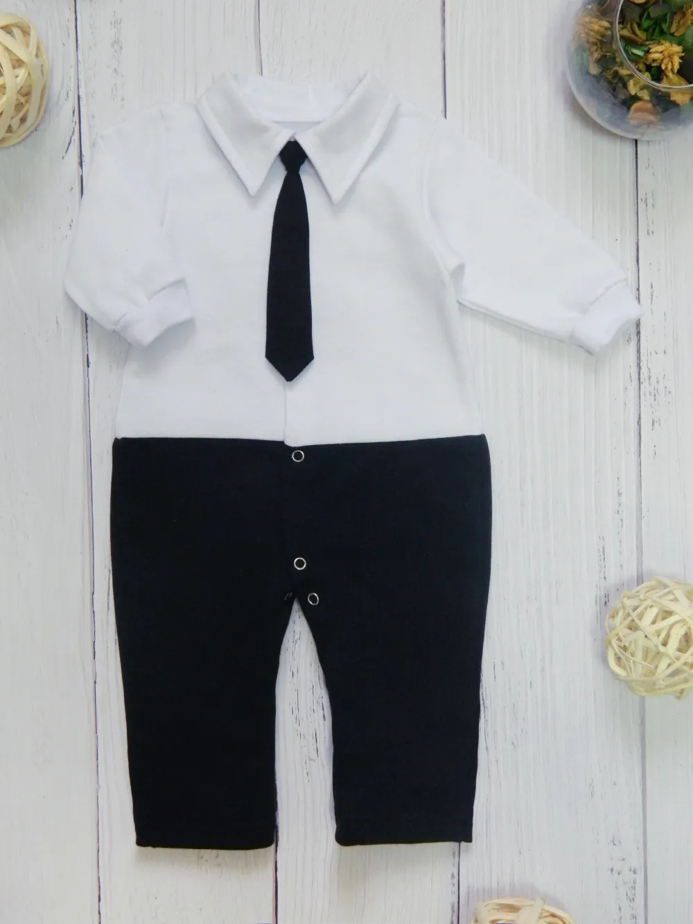 Оригинальный комплект для маленького стиляги. Набор состоит из комбинезона с длинными рукавами и пиджачка на кнопочках. Комплект выполнен из футера с начесом, дополнен галстуком. В таком наряде Ваш малыш будет самым стильным на любом мероприятии.