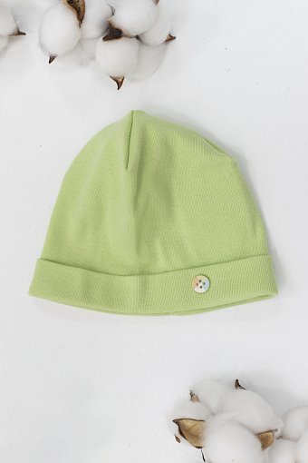 Шапочка выполнена из хлопкового полотна, с отворотом и пуговицей сбоку.