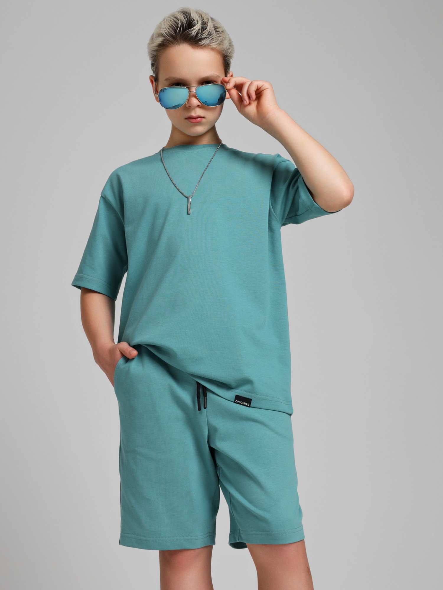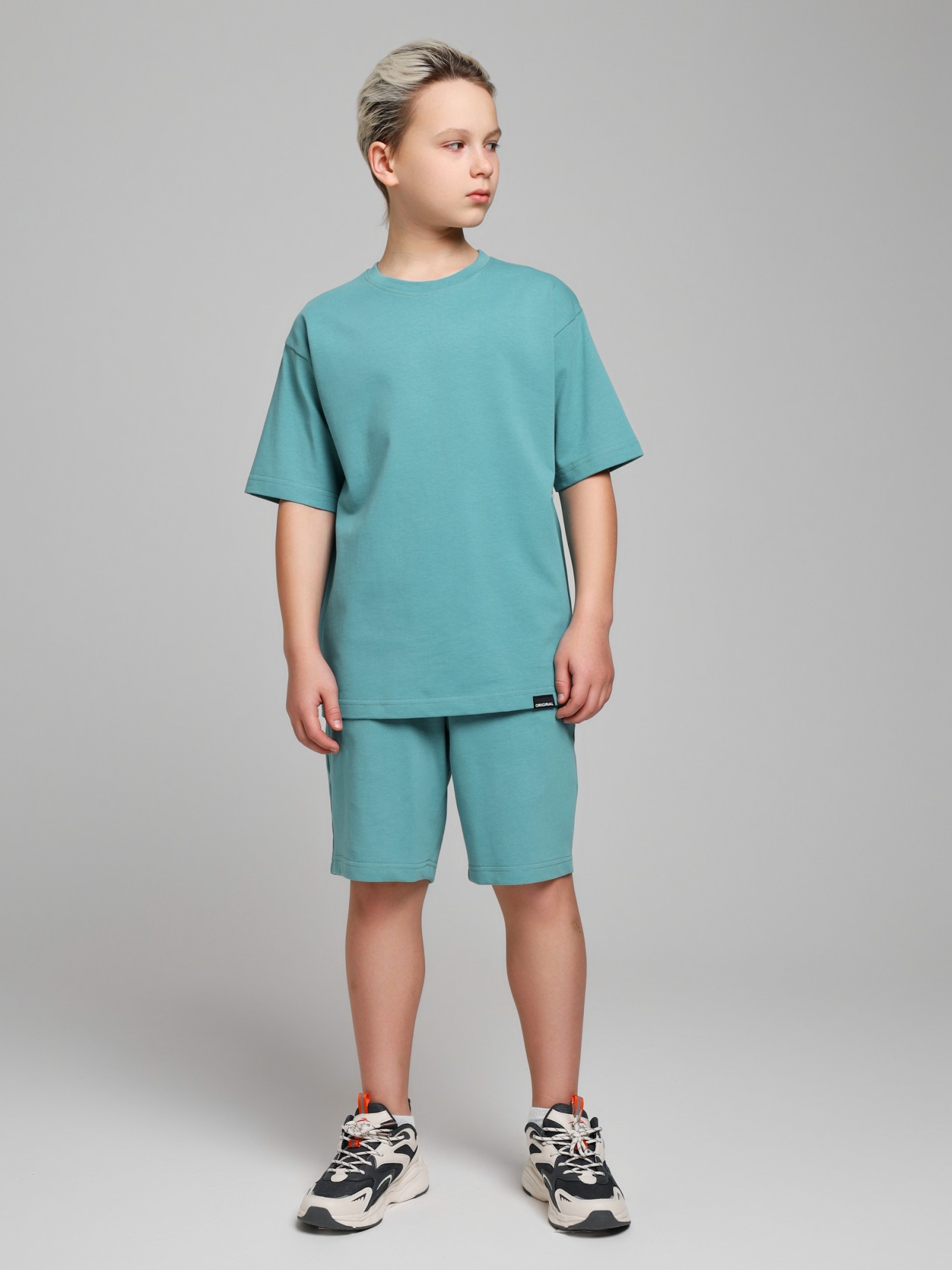 Костюмдля мальчика из плотного гладкокрашеного трикотажного полотна "кулирка", состоящий из футболки и шорт. Футболка - свободного покроя, с удлиненными плечевым и швами, короткими втачными рукавами и горловиной овальной формы, обработанной втачной планкой. В нижней части переда слева настрочен декоративный элемент прямоугольной формы. По горловине проложена отделочная строчка. Шорты - классического покроя, на притачном поясе с эластичной тесьмой внутри и карманами в боковых швах. Для регулирования степени прилегания шорт по талии в пояс вставлен шнурок, продетый через две петли в центре пояса.