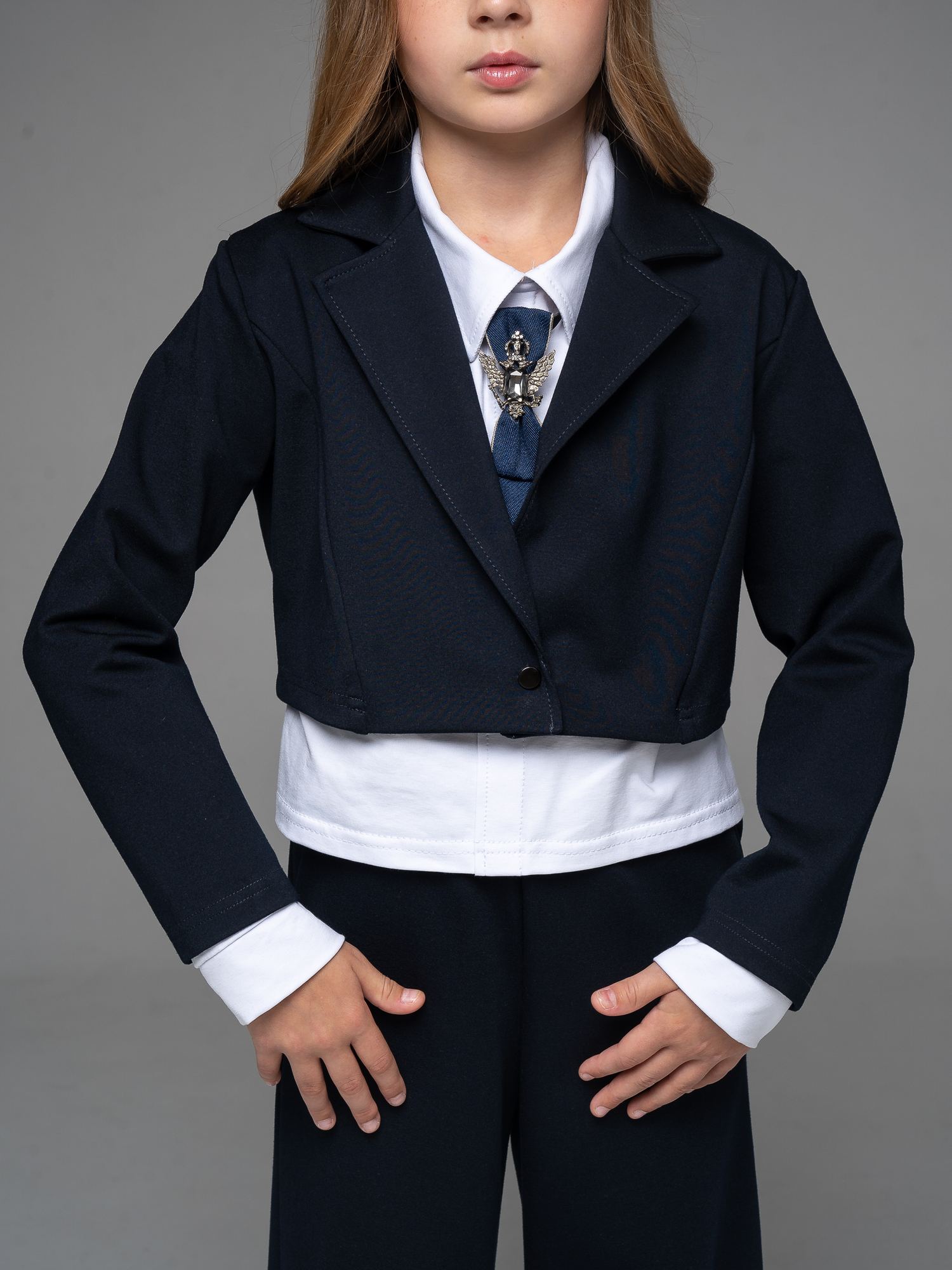 "Школьные будни – не просто обязанность, но и возможность проявить стиль и индивидуальность. Идеальным дополнением школьного гардероба вашей малышки станет укороченный пиджак из джерси темно-синего цвета для девочки .