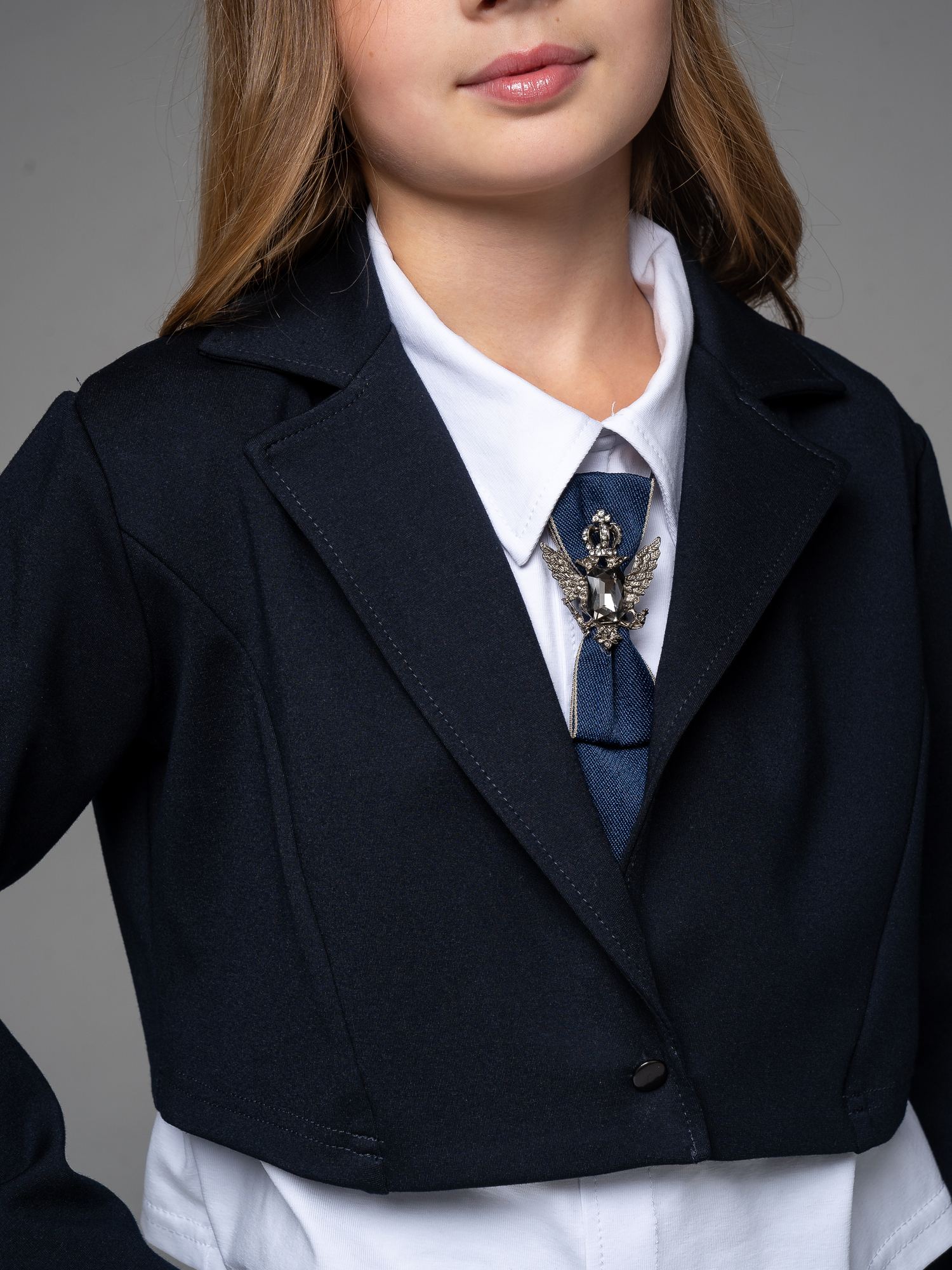 "Школьные будни – не просто обязанность, но и возможность проявить стиль и индивидуальность. Идеальным дополнением школьного гардероба вашей малышки станет укороченный пиджак из джерси темно-синего цвета для девочки .