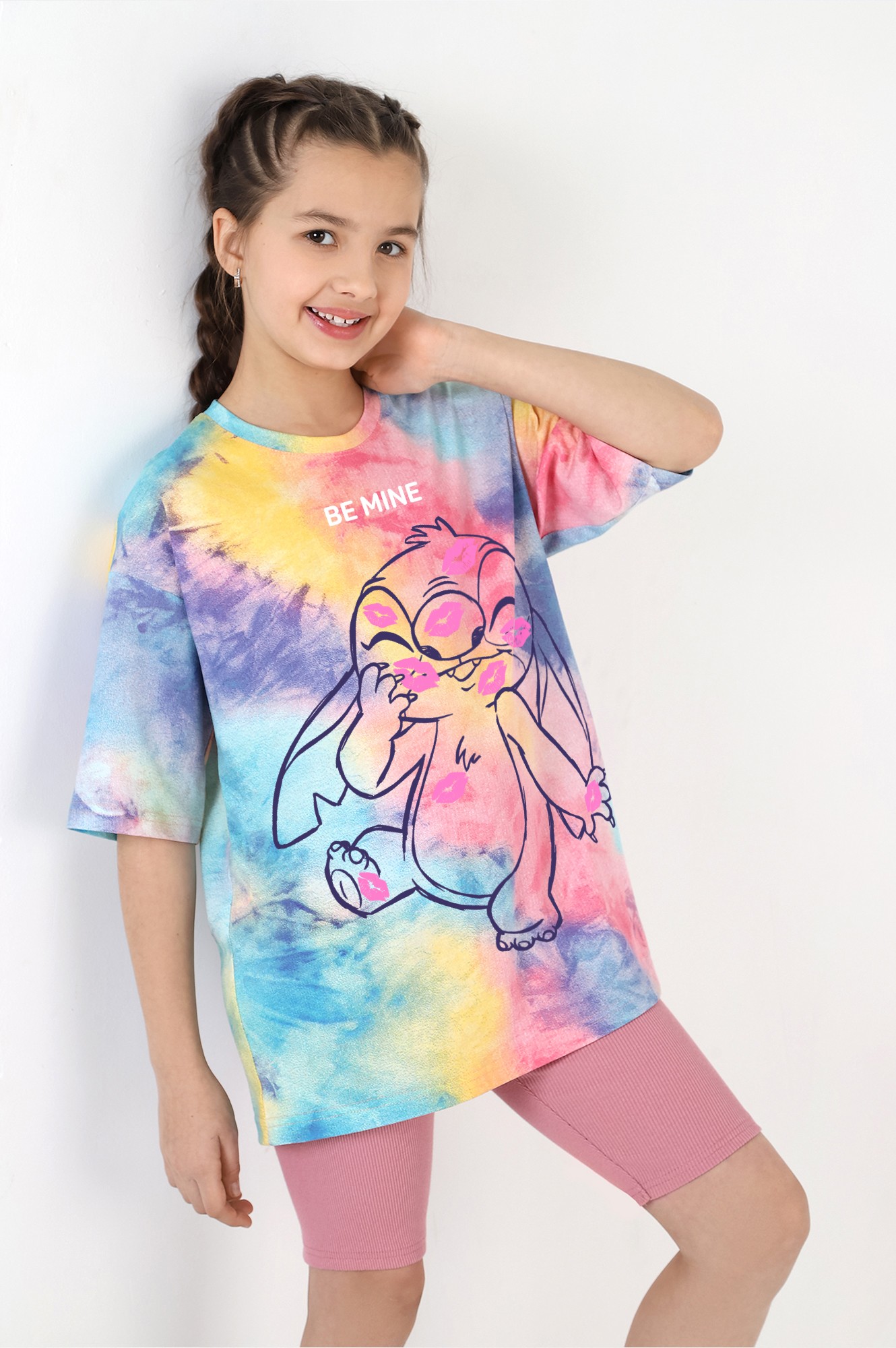 Модный и комфортный костюм для девочки. Футболка из гладкокрашеного трикотажного полотна "кулирка", свободная, удлиненная, со спущенной линией плеч и с ярким принтом на полочке. Бриджи - велосипедки из полотна "кашкорсе", плотно прилегающие к телу, длиной выше колен