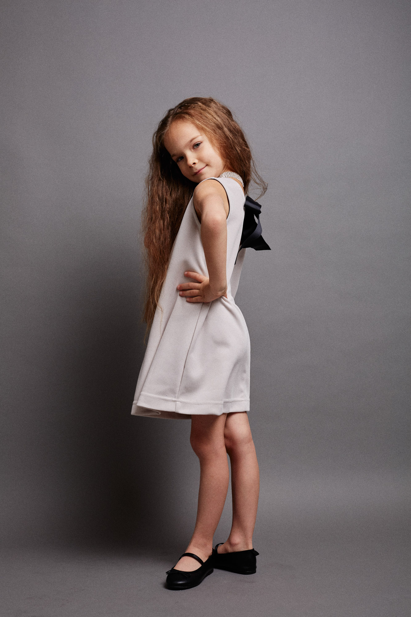 На спинке глубокий разрез, который фиксируется широким черным бантом из декоративной текстурированной ленты.