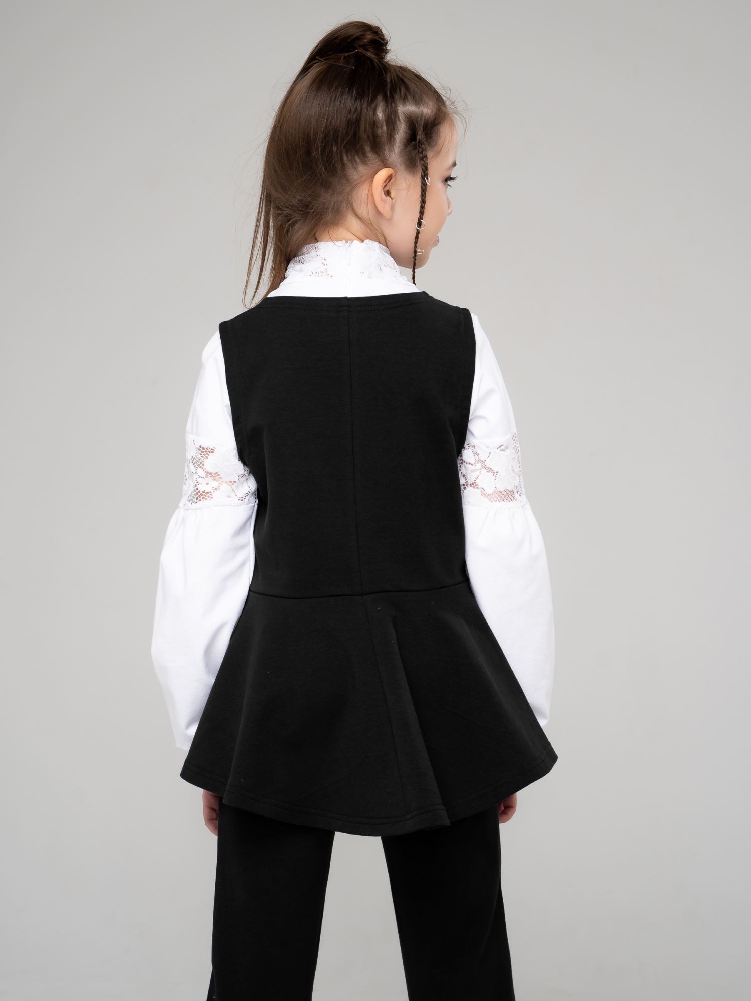 Школьный жилет из футера черного цвета для девочки , отрезной по линии талии, с баской. По центру полочки - отделка в виде узкой рюши. Баска ассимметричного кроя, немного удлиненная сзади. Изделие выполнено из трикотажа премиального качества - ПЕНЬЕ, с содержанием хлопка более 92%