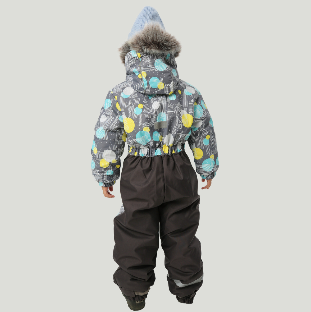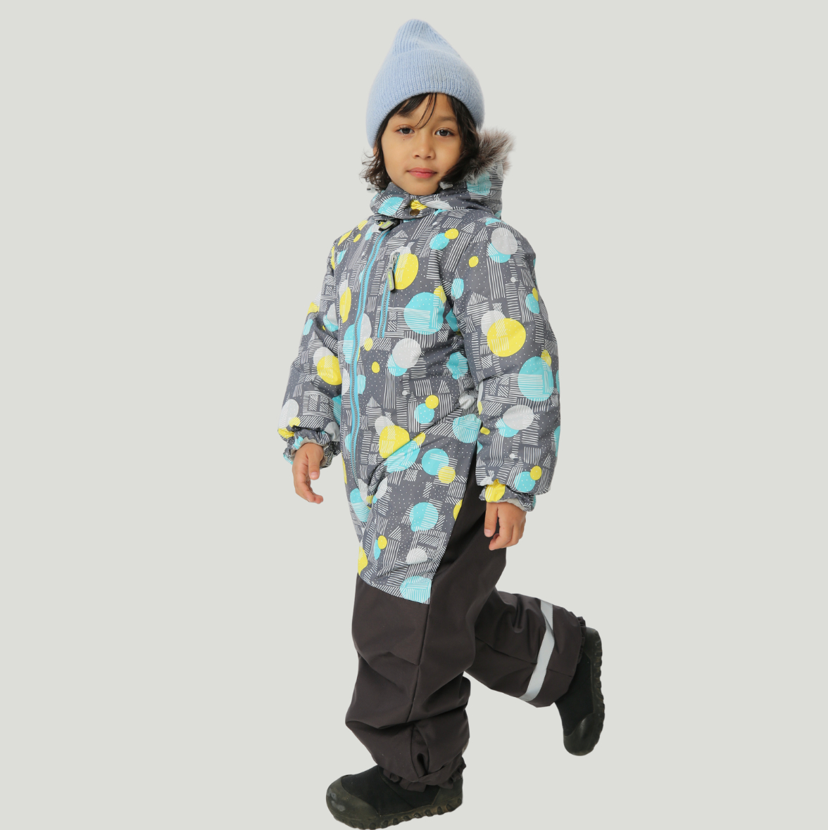 Функциональные элементы утепленного комбинезона для детей: -Съёмный капюшон и опушка из искусственного меха;