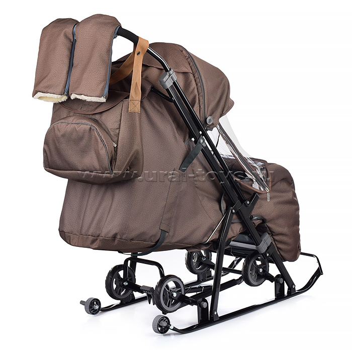 Для наилучшего передвижения по асфальтированной поверхности на санках-колясках предусмотрены сверх проходимые прорезиненные колеса на педальном механизме. Достаточно нажать на него ногой и переставить санки на колеса.