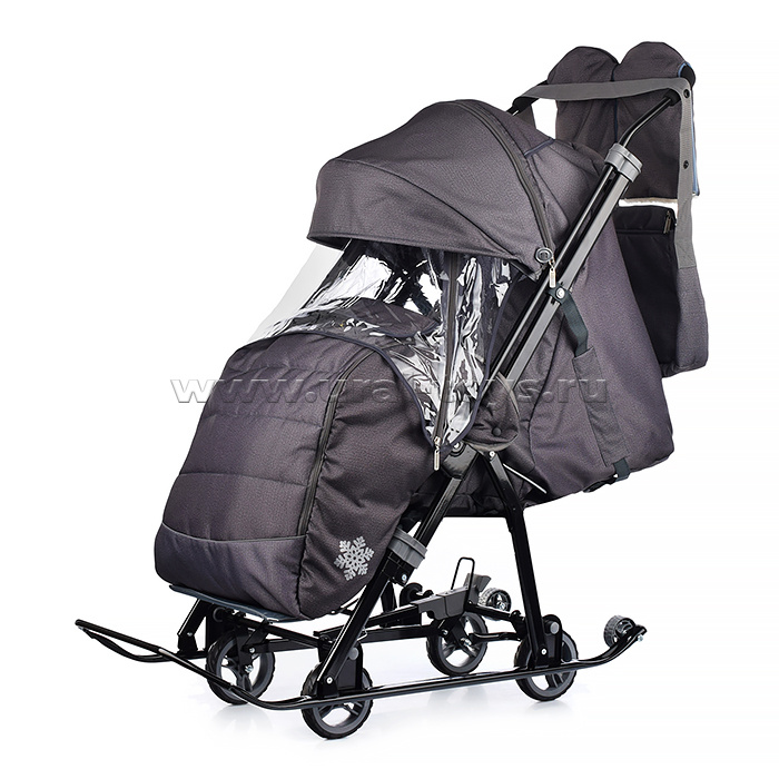 Для наилучшего передвижения по асфальтированной поверхности на санках-колясках предусмотрены сверх проходимые прорезиненные колеса на педальном механизме. Достаточно нажать на него ногой и переставить санки на колеса.