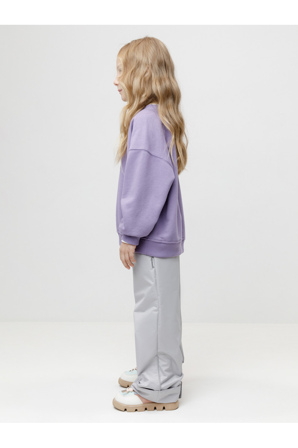 Ветровочные брюки из мембранной ткани с дополнительной тефлоновой обработкой. Данный вид обработки предохраняет изделие от загрязнения и лучше отводит влагу. Подклад из хлопка в размере 80-86 и из флиса с полиэстером в размерах от 86-92 до 116-122. Эластичный пояс регулируется по ширине при помощи шнурка со стоппером. Длина брюк регулируется при помощи липучек. Модель оснащена системой регулировки длины: подворот добавляет 5 см, что позволяет брюкам «расти» вместе с ребёнком. Во всех изделиях верхнего ассортимента для безопасности ребёнка предусмотрены светоотражающие элементы.
