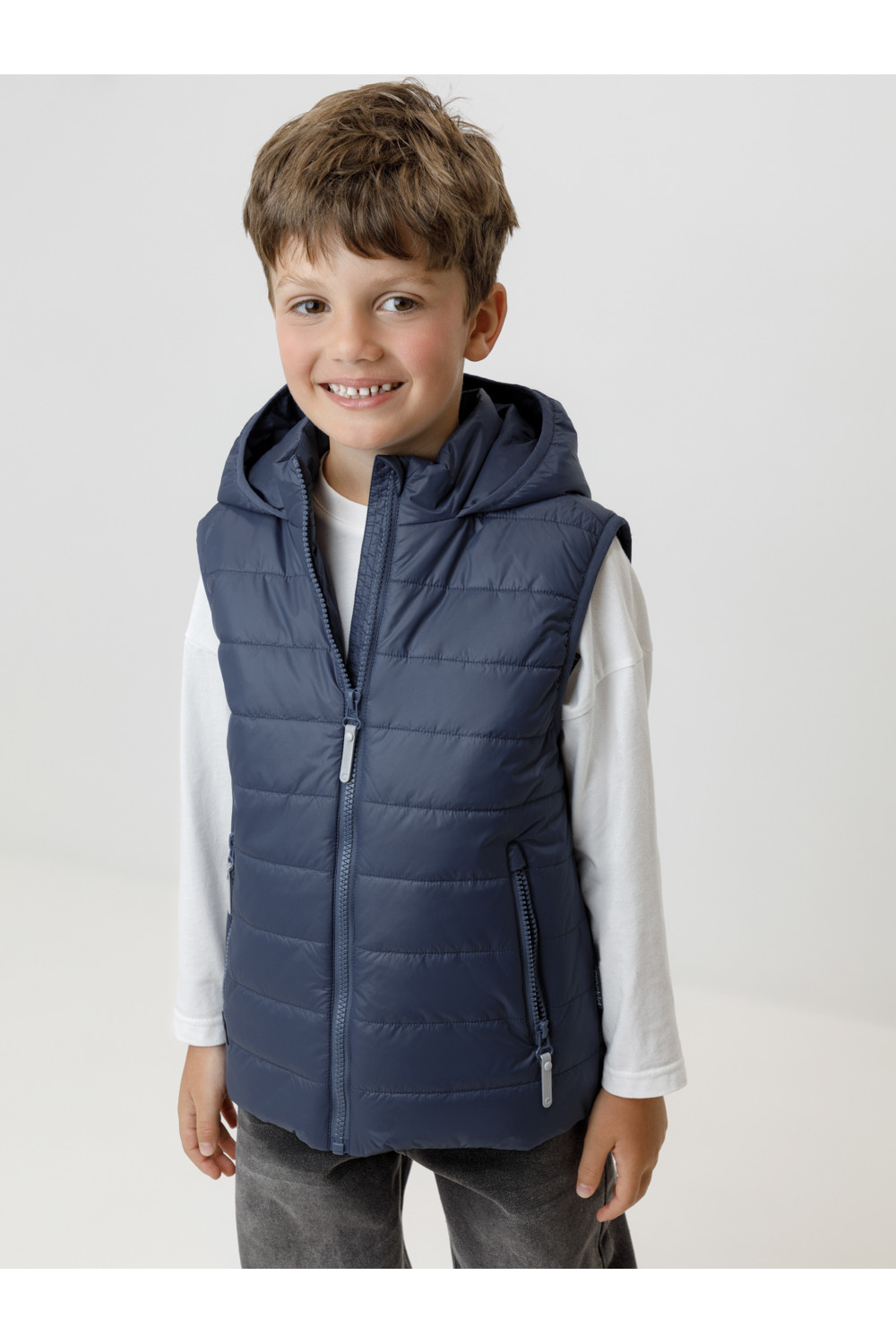 Стёганый жилет с капюшоном для мальчика с утеплителем Fellex®, 120 г/м2. Выполнен из мембранной ткани с дополнительной тефлоновой обработкой. Данный вид обработки предохраняет изделие от загрязнения и лучше отводит влагу. Подклад из хлопка в размерах 86-92 и 92-98 и из полиэстера в размерах от 98-104 до 122-128. Капюшон не снимается. По краю капюшона и проймам обработка эластичным кантом для лучшего прилегания. Изделие застёгивается на молнию, предусмотрена защита подбородка. Два кармана по бокам на молниях. Во всех изделиях верхнего ассортимента для безопасности ребёнка предусмотрены светоотражающие элементы.