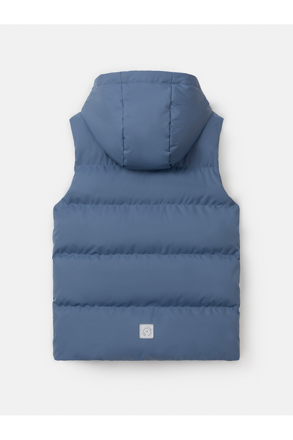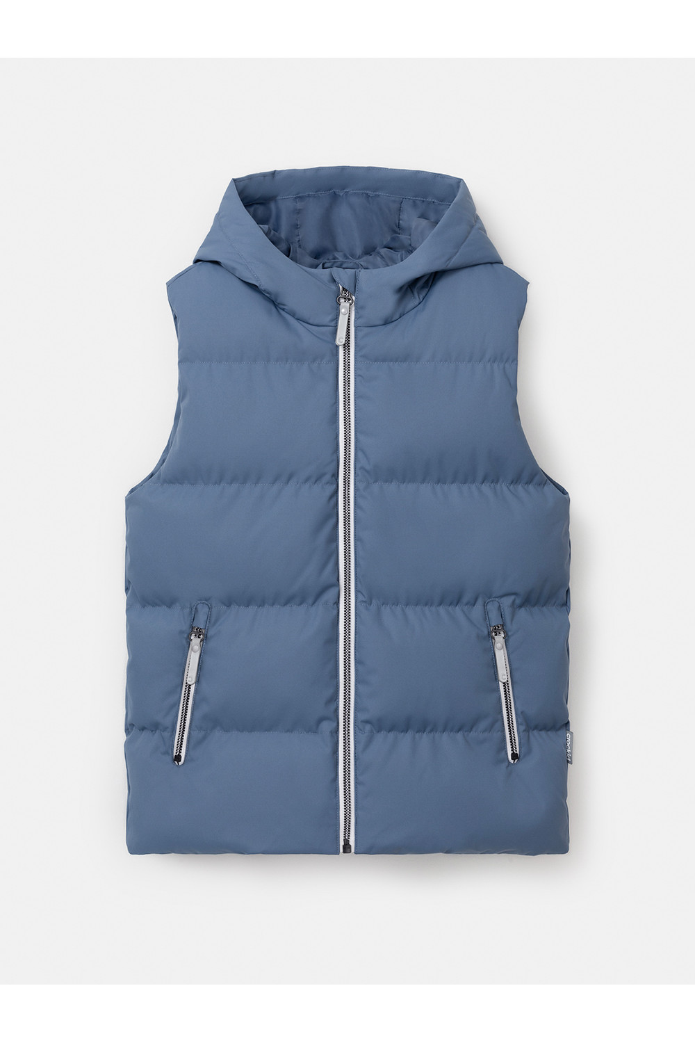 Стёганый жилет с капюшоном для мальчика с утеплителем, 120 г/м2. Выполнен из мембранной ткани с дополнительной тефлоновой обработкой. Данный вид обработки предохраняет изделие от загрязнения и лучше отводит влагу. Подклад из 100% полиэстра. Капюшон не снимается. Изделие застёгивается на молнию, предусмотрена защита подбородка. Два кармана по бокам застёгиваются на молнии. Во всех изделиях верхнего ассортимента для безопасности ребёнка предусмотрены светоотражающие элементы.