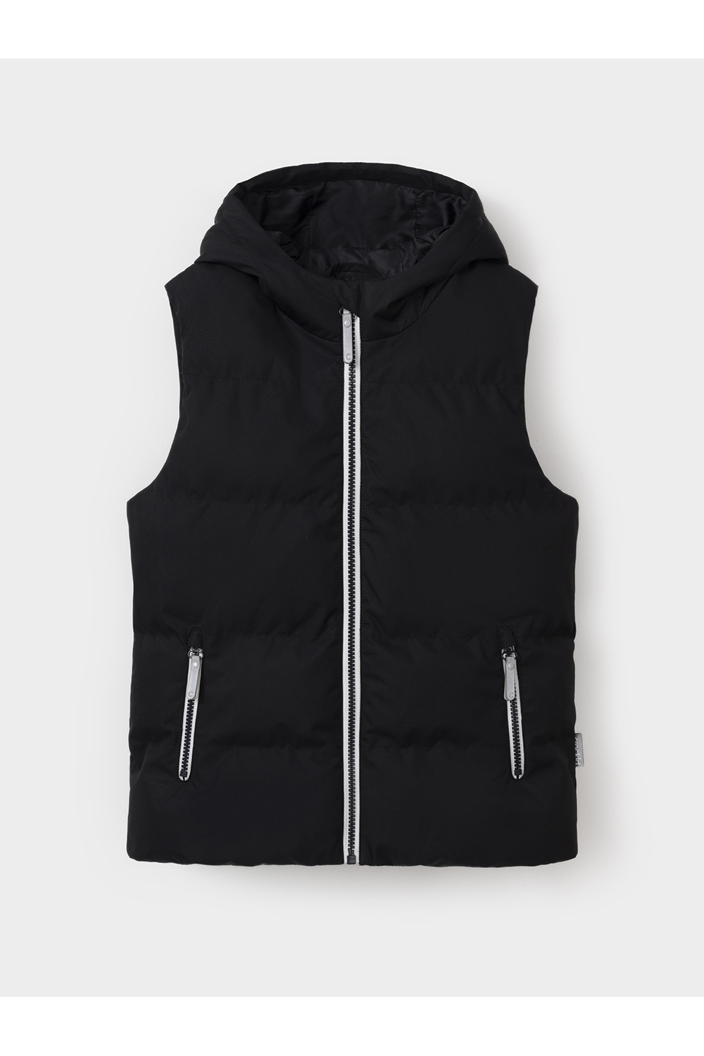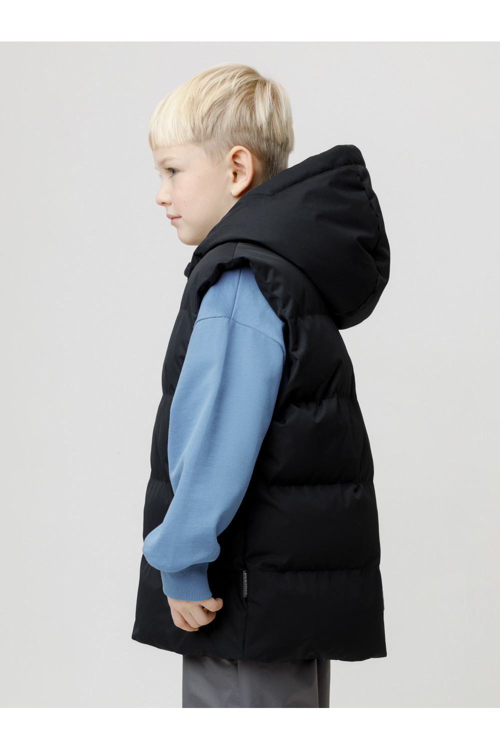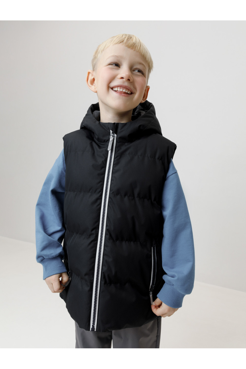 Стёганый жилет с капюшоном для мальчика с утеплителем, 120 г/м2. Выполнен из мембранной ткани с дополнительной тефлоновой обработкой. Данный вид обработки предохраняет изделие от загрязнения и лучше отводит влагу. Подклад из 100% полиэстра. Капюшон не снимается. Изделие застёгивается на молнию, предусмотрена защита подбородка. Два кармана по бокам застёгиваются на молнии. Во всех изделиях верхнего ассортимента для безопасности ребёнка предусмотрены светоотражающие элементы.