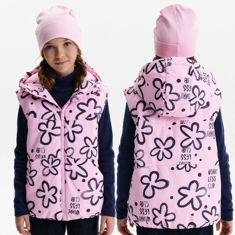 Состав: 100%полиэстер+мембрана, подклад: 100%полиэстер, утеплитель: 100%полиэстерОписание: Жилетка для девочки — функциональный и удобный вариант верхней одежды для прохладной погоды и межсезонья. Детская утепленная жилетка выполнена в среднем объеме, благодаря чему комфортно садится по фигуре и подходит для повседневной носки. Жилет детский имеет декоративные членения по переду и спинке, которые формируют аккуратный внешний вид и подчёркивают силуэт. Низ изделия собран на внутреннюю резину, что помогает создать овальный силуэт, а дополнительная утяжка эластичным шнуром со стопперами позволяет регулировать посадку и защищает от прохладного воздуха. Модель дополнена капюшоном с утяжкой эластичным шнуром со стопперами, который обеспечивает защиту от ветра. По переду расположены наклонные карманы, встроенные в декоративные членения — практичное и эстетичное решение для повседневного использования. Центральная молния с изнаночной стороны защищена ветрозащитной планкой, что повышает комфорт при носке в ветреную погоду. Внутри жилетки используется тонкий подклад из полиэстера, обеспечивающий легкость изделия и удобство в уходе. В качестве утеплителя применяется синтепон плотностью 150 г/м², который хорошо сохраняет тепло и подходит для активных детей. Утепленная детская жилетка для девочки станет практичным выбором для прогулок, школы и ежедневного использования.