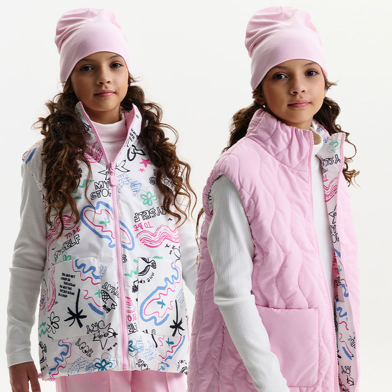 Состав: 100%полиэстер+мембрана, подклад: 100%полиэстер, утеплитель: 100%полиэстерОписание: Жилетка для девочки — удобный и функциональный вариант верхней одежды для межсезонья и прохладной погоды. Детская утепленная жилетка выполнена в двустороннем формате, что позволяет менять внешний вид изделия в зависимости от образа и настроения. Жилет детский имеет увеличенный объем и прямой силуэт, благодаря чему комфортно сидит, не сковывает движения и подходит для многослойных комплектов. Модель дополнена накладными карманами, удобными для повседневной носки. Одна сторона жилетки простегана декоративной отстрочкой, вторая выполнена гладкой, без стёжки, что делает модель универсальной и визуально аккуратной. Воротник оформлен в виде высокой стойки, обеспечивающей защиту от ветра. Молния с двусторонним пуллером позволяет легко застегивать жилет с любой стороны, что особенно удобно для двусторонней конструкции. По пройме и по верхнему краю стойки проложен внутренний эластик, который улучшает посадку и комфорт при носке. В качестве утеплителя используется синтепон 60 г/м² в два слоя (120 г/м²) — оптимальный вариант для активных детей, обеспечивающий тепло без утяжеления. По низу жилета предусмотрена утяжка эластичным шнуром со стопперами, позволяющая регулировать посадку и защищать от прохладного воздуха. Утепленная детская жилетка для девочки подходит для прогулок, школы и повседневного использования.