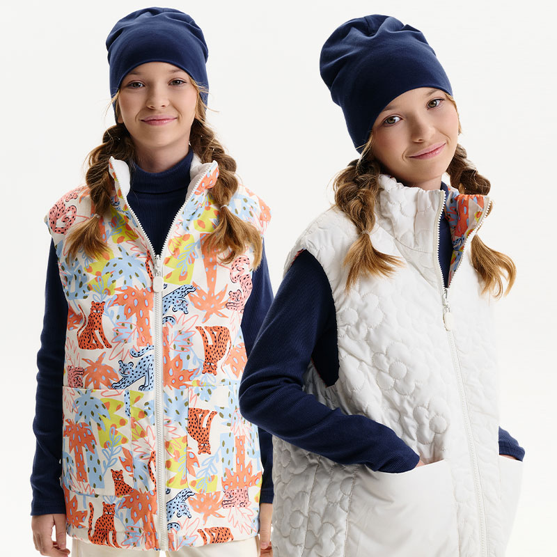 Состав: 100%полиэстер+мембрана, подклад: 100%полиэстер, утеплитель: 100%полиэстерОписание: Жилетка для девочки — удобный и функциональный вариант верхней одежды для межсезонья и прохладной погоды. Детская утепленная жилетка выполнена в двустороннем формате, что позволяет менять внешний вид изделия в зависимости от образа и настроения. Жилет детский имеет увеличенный объем и прямой силуэт, благодаря чему комфортно сидит, не сковывает движения и подходит для многослойных комплектов. Модель дополнена накладными карманами, удобными для повседневной носки. Одна сторона жилетки простегана декоративной отстрочкой, вторая выполнена гладкой, без стёжки, что делает модель универсальной и визуально аккуратной. Воротник оформлен в виде высокой стойки, обеспечивающей защиту от ветра. Молния с двусторонним пуллером позволяет легко застегивать жилет с любой стороны, что особенно удобно для двусторонней конструкции. По пройме и по верхнему краю стойки проложен внутренний эластик, который улучшает посадку и комфорт при носке. В качестве утеплителя используется синтепон 60 г/м² в два слоя (120 г/м²) — оптимальный вариант для активных детей, обеспечивающий тепло без утяжеления. По низу жилета предусмотрена утяжка эластичным шнуром со стопперами, позволяющая регулировать посадку и защищать от прохладного воздуха. Утепленная детская жилетка для девочки подходит для прогулок, школы и повседневного использования.