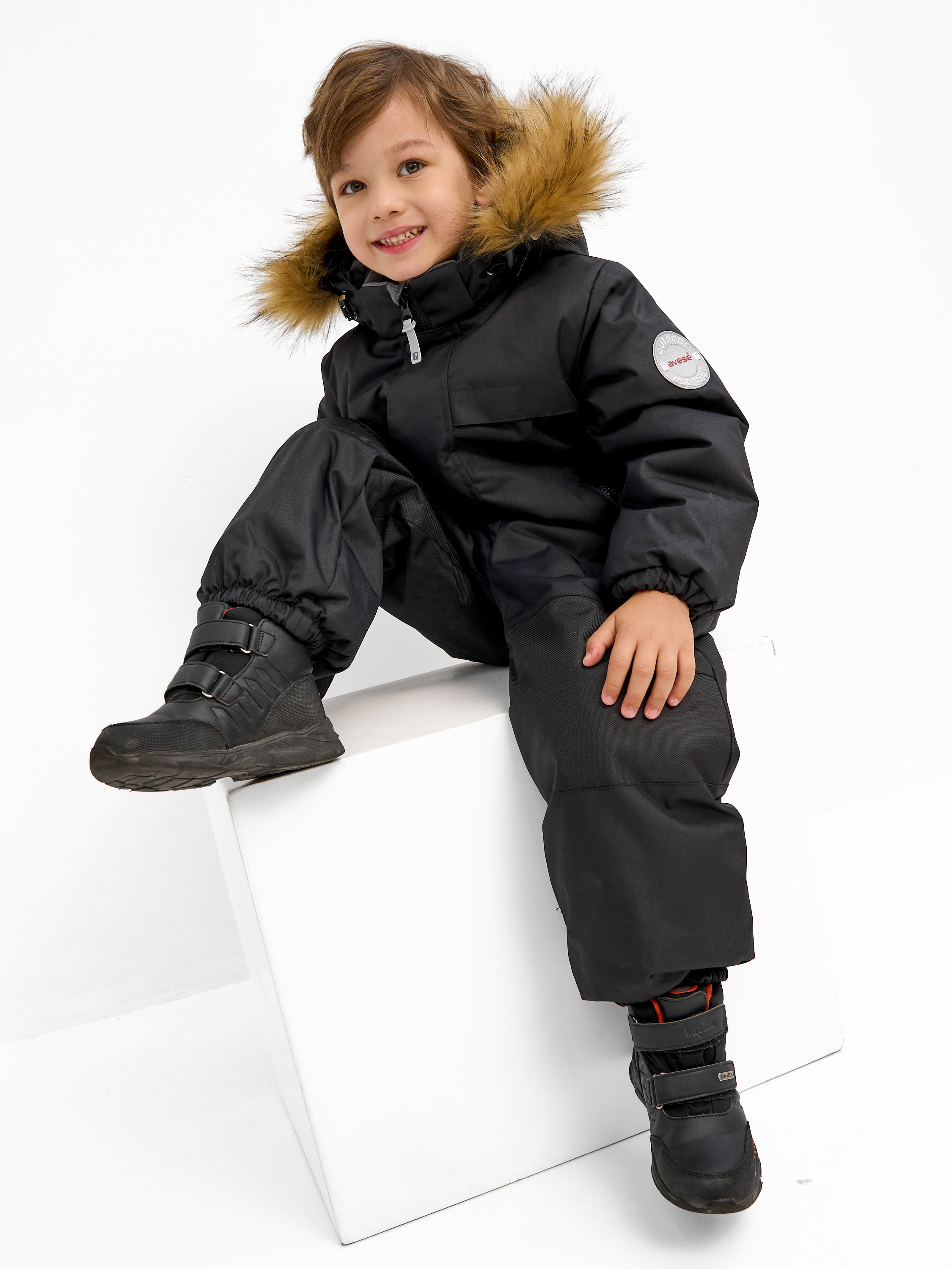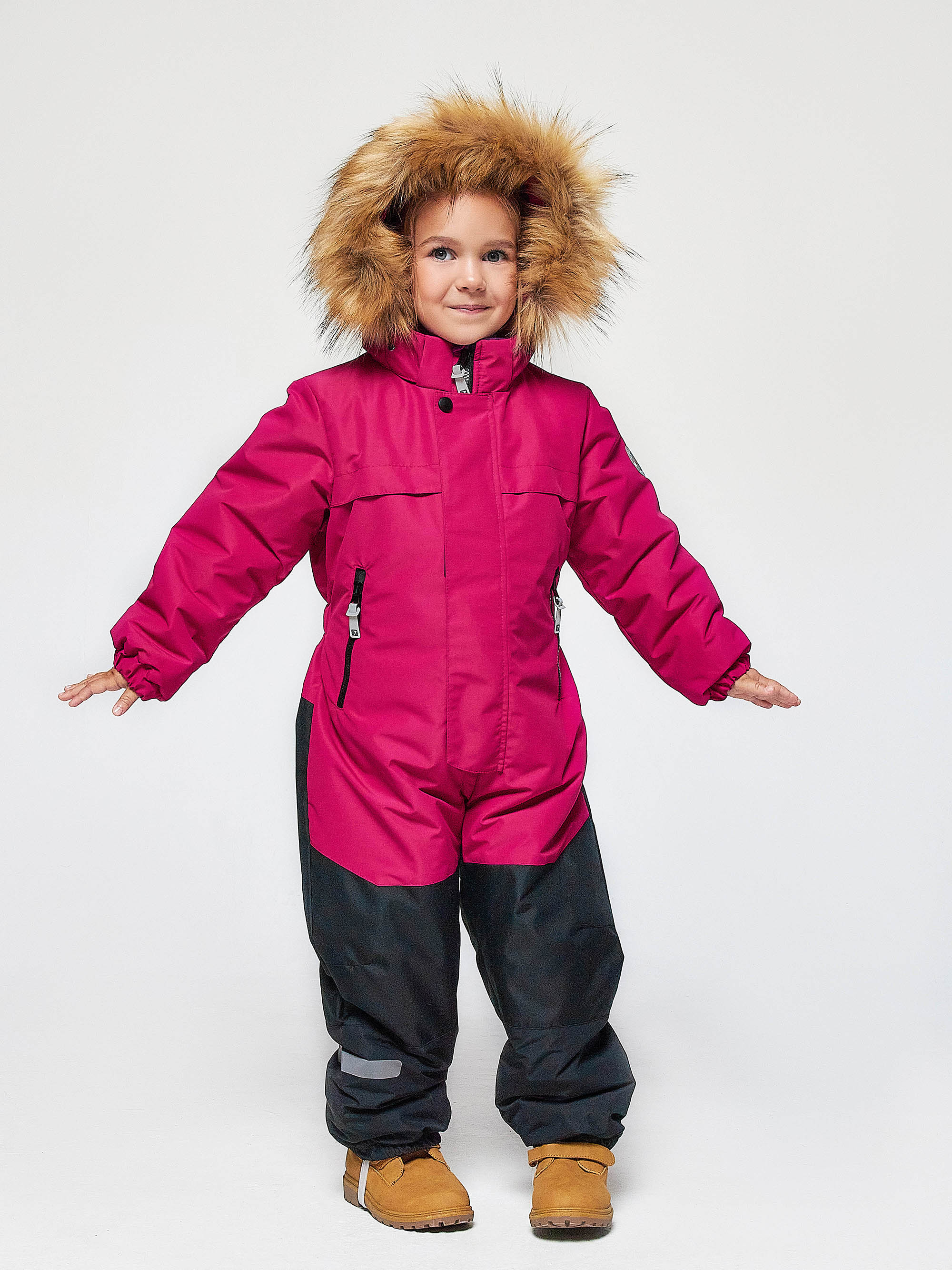 Комбинезон зимний для детей дошкольного и младшего школьного возраста из мембранной ткани. Задняя часть брюк и колени из особо прочной ткани, устойчивой к истиранию. Центральная молния закрыта планкой на липучках и кнопках. Комбинированная подкладка из цветного флиса и шелка. Съемный капюшон с отстёгивающейся опушкой из искусственного меха. 2 передних кармана с молниями. Низ рукава - манжет с эластичной тесьмой. Низ брюк с эластичной тесьмой и пристёгивающимися силиконовыми штрипками. На комбинезоне расположены светоотражающие элементы. Рассчитана на температуру от -10 до -25. 100% полиэстер
