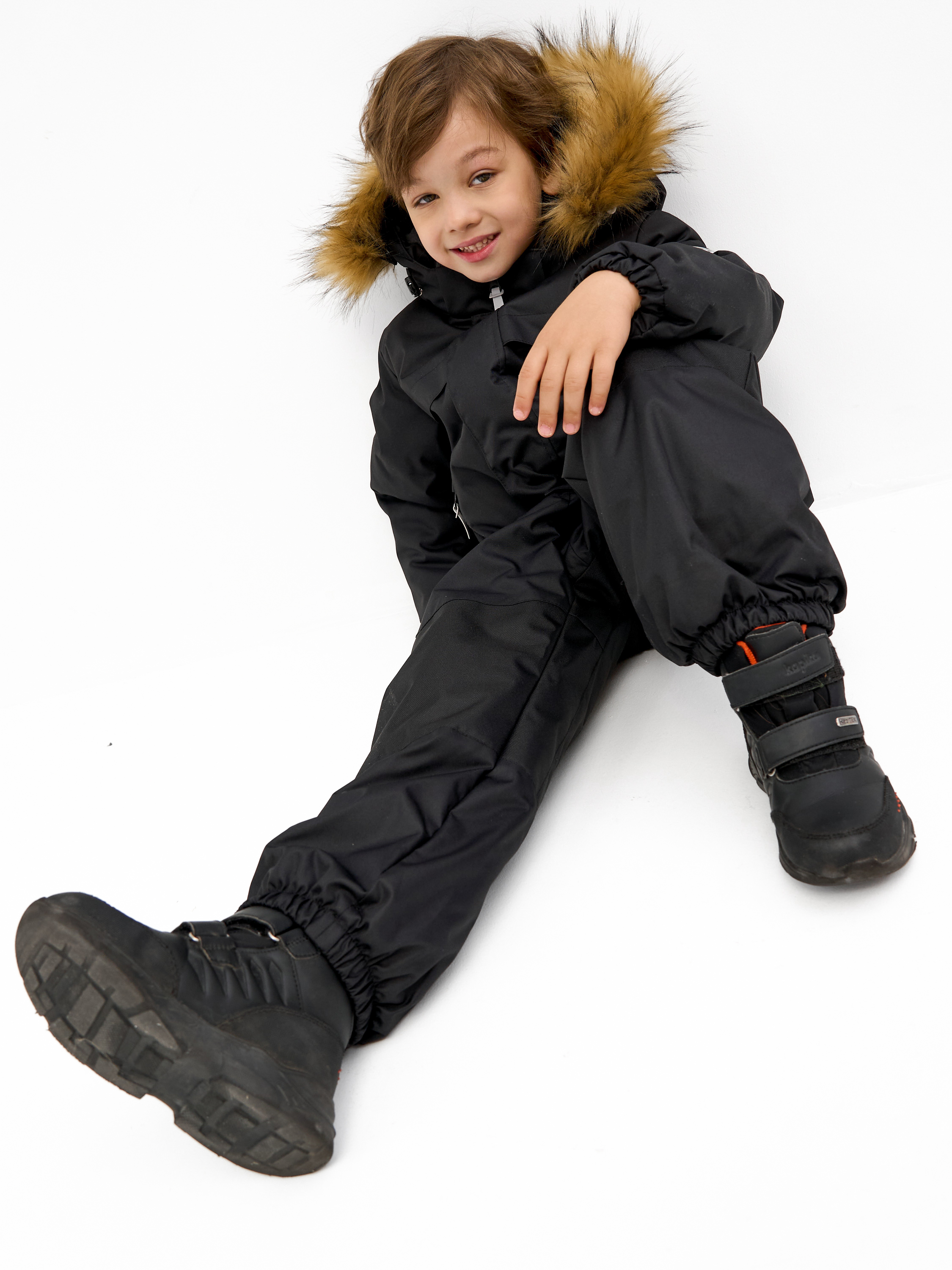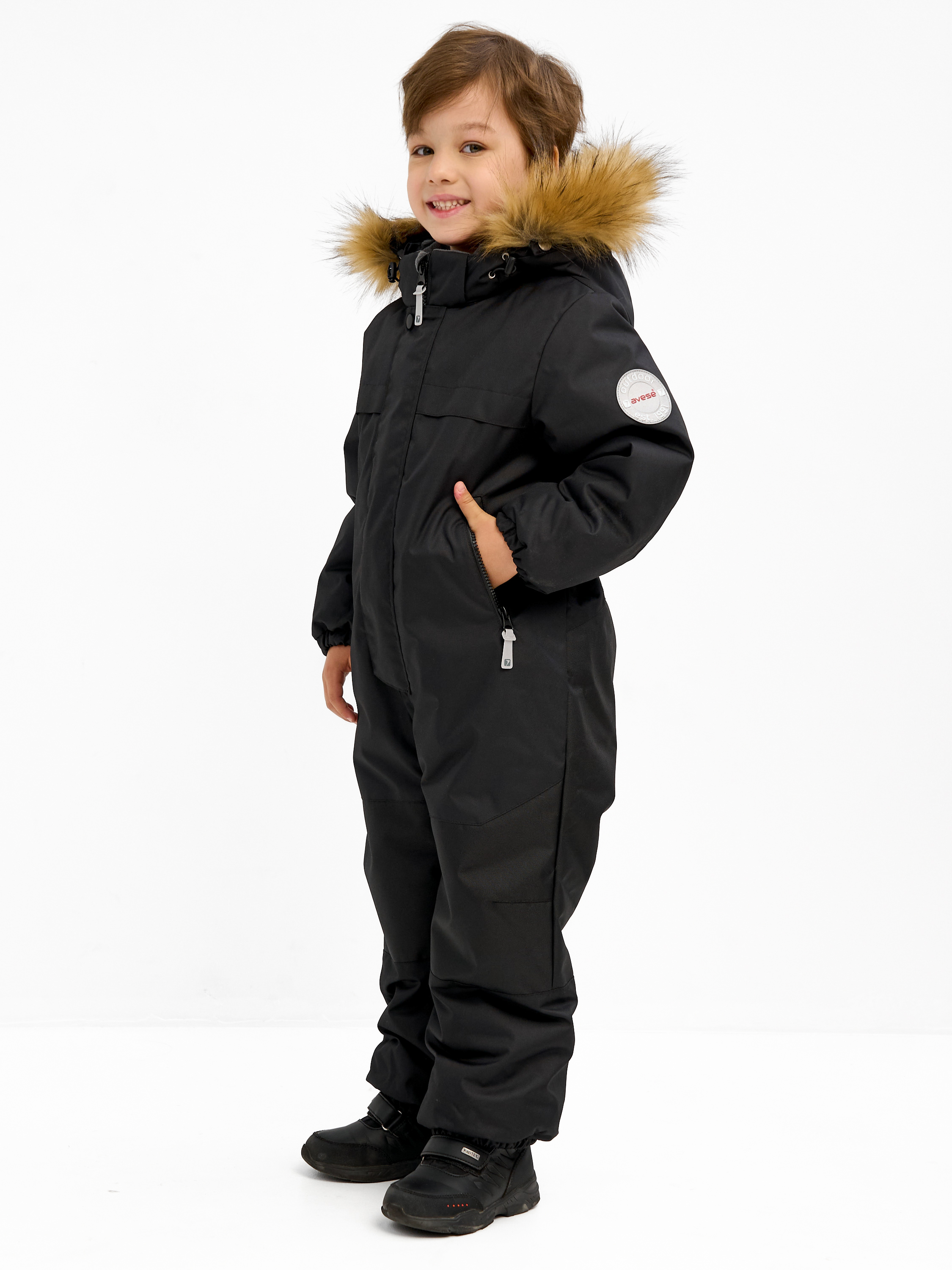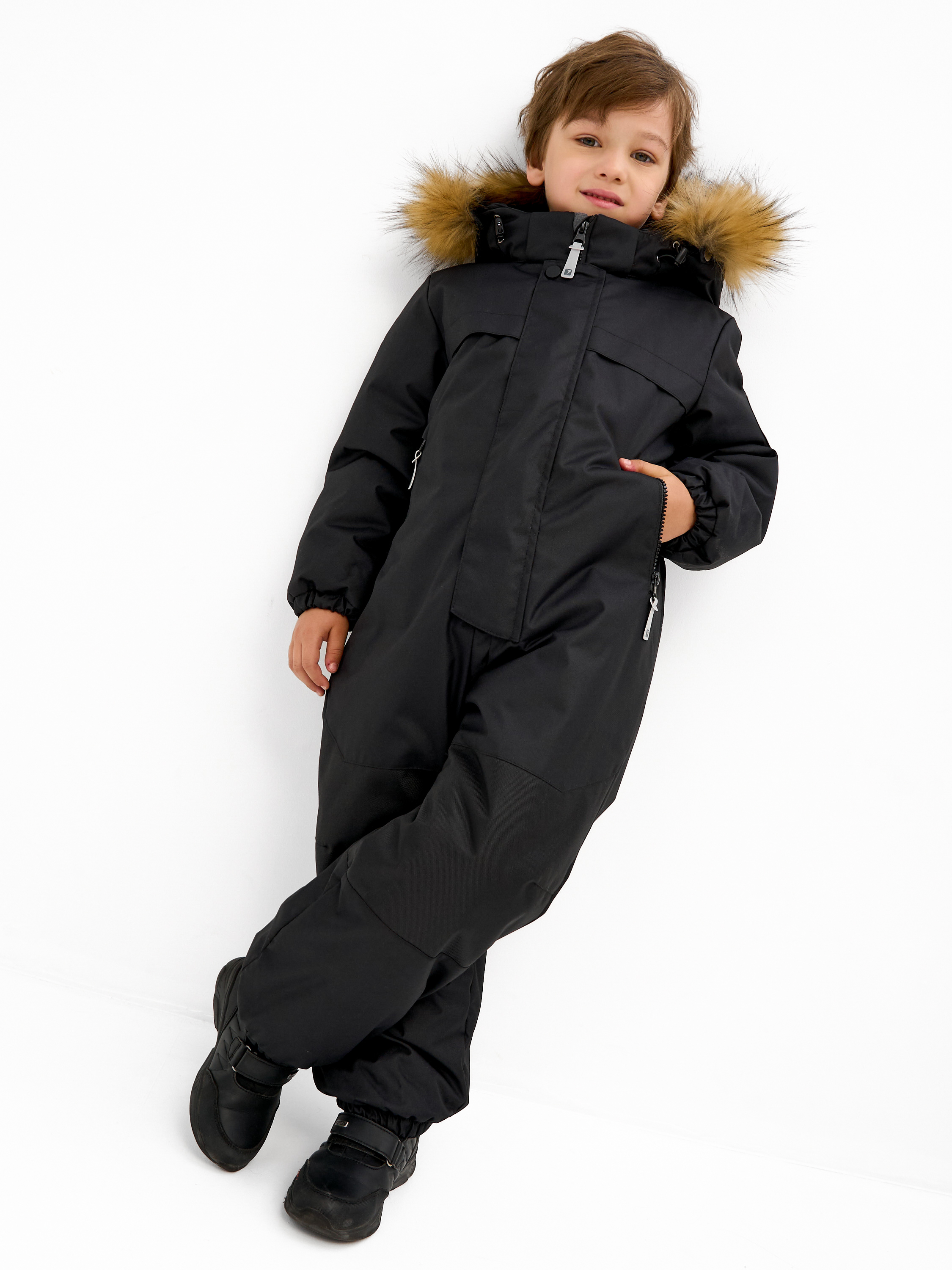 Комбинезон зимний для детей дошкольного и младшего школьного возраста из мембранной ткани. Задняя часть брюк и колени из особо прочной ткани, устойчивой к истиранию. Центральная молния закрыта планкой на липучках и кнопках. Комбинированная подкладка из цветного флиса и шелка. Съемный капюшон с отстёгивающейся опушкой из искусственного меха. 2 передних кармана с молниями. Низ рукава - манжет с эластичной тесьмой. Низ брюк с эластичной тесьмой и пристёгивающимися силиконовыми штрипками. На комбинезоне расположены светоотражающие элементы. Рассчитана на температуру от -10 до -25. 100% полиэстер