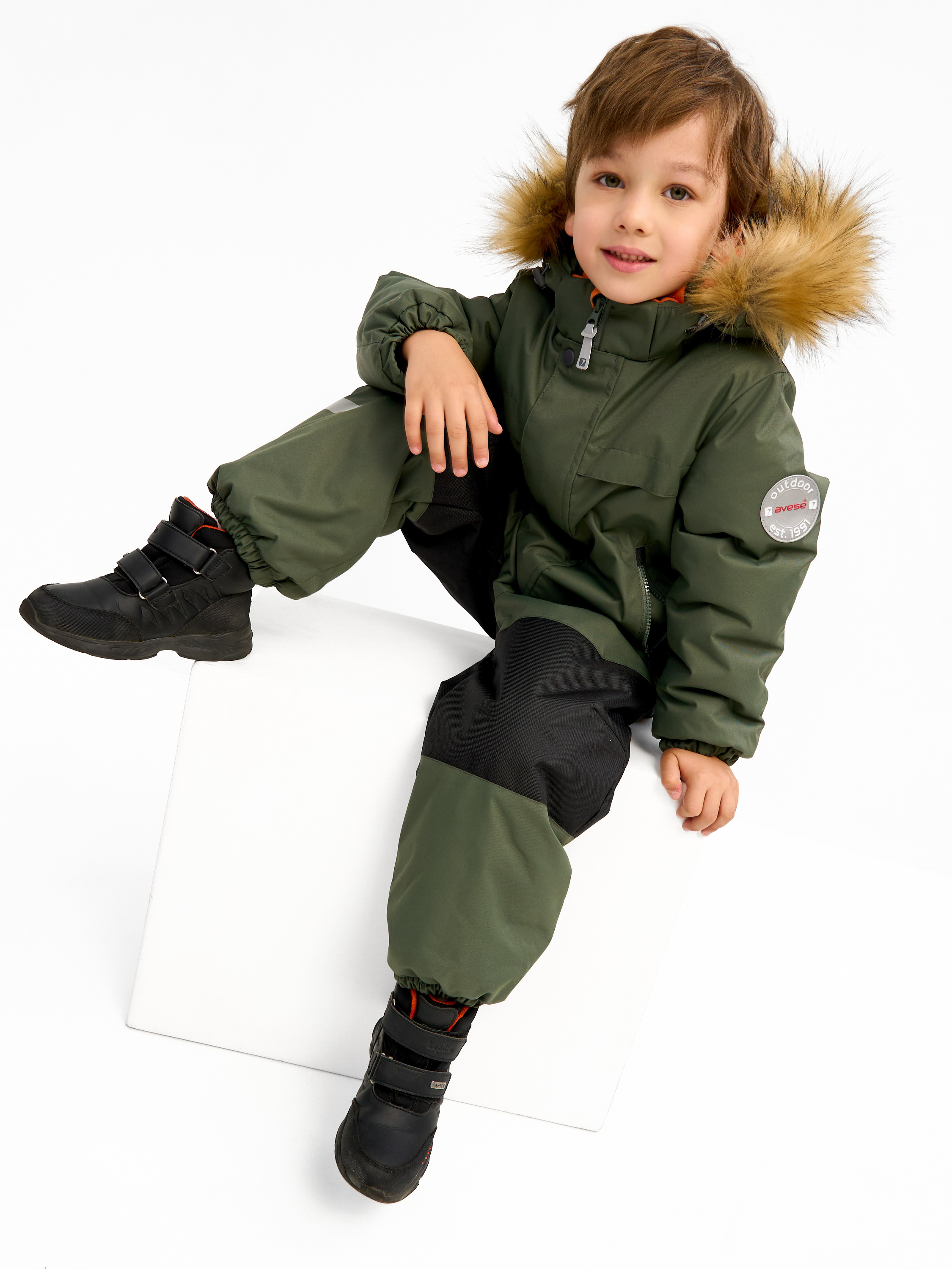 Комбинезон зимний для детей дошкольного и младшего школьного возраста из мембранной ткани. Задняя часть брюк и колени из особо прочной ткани, устойчивой к истиранию. Центральная молния закрыта планкой на липучках и кнопках. Комбинированная подкладка из цветного флиса и шелка. Съемный капюшон с отстёгивающейся опушкой из искусственного меха. 2 передних кармана с молниями. Низ рукава - манжет с эластичной тесьмой. Низ брюк с эластичной тесьмой и пристёгивающимися силиконовыми штрипками. На комбинезоне расположены светоотражающие элементы. Рассчитана на температуру от -10 до -25. 100% полиэстер