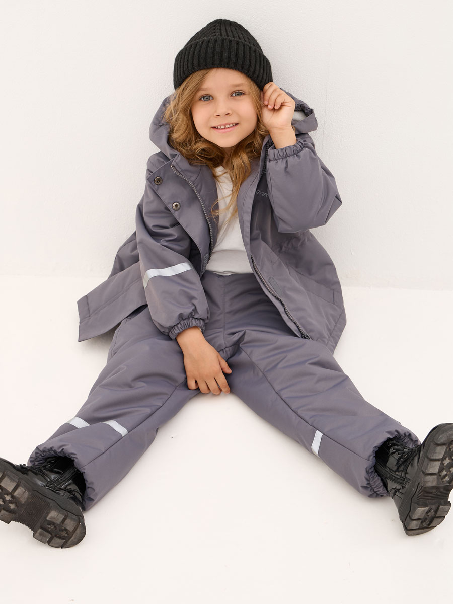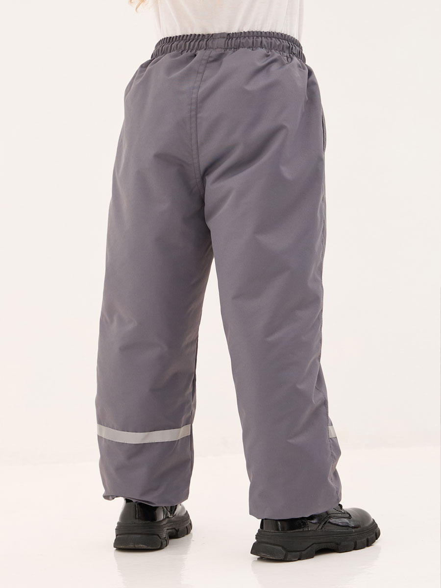 В брюках подкладка настегана на утеплитель.  Пояс отрезной, низ брюк с резиной. Карманы в боковых швах. Пояс брюк прострочен с эластичной тесьмой. Спереди  с внутренней стороны пояса пробиты петли, через которые продет шнур. На куртке и брюках расположены светоотражающие элементы.