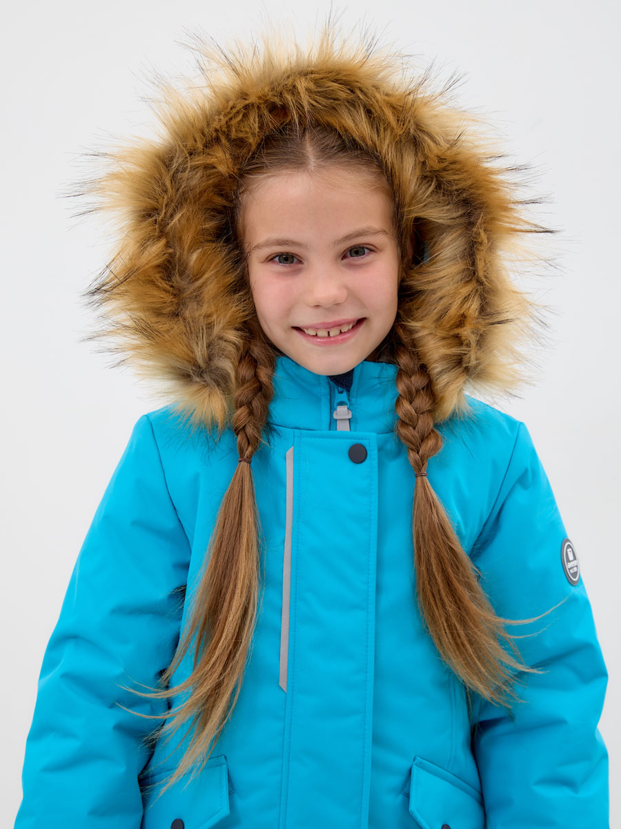 Куртка прямого силуэта, с втачным воротником-стойкой и отстёгивающимся капюшоном, с отстегивающейся опушкой из искусственного меха (енот). Застёжка на молнию, закрытая планкой на кнопках и липучках. 2 наружных кармана с клапаном на кнопке, 1 внутренний карман с липучкой. Подкладка из цветного флиса. В подкладке помочи из тесьмы для ношения куртки за плечами.