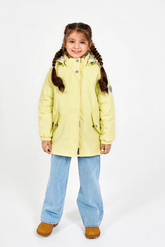 Куртка для девочек дошкольного возраста из мембранной ткани. Центральная молния закрыта планкой на липучках и кнопках. Комбинированная подкладка из цветного флиса и шелка с внутренним карманом на липучке. Съёмный капюшон с подкладкой из цветного флиса. 2 передних кармана с клапаном на кнопке. На куртке расположены светоотражающие элементы. Рассчитана на температуру от 0 до +10.