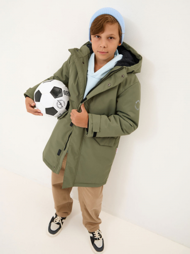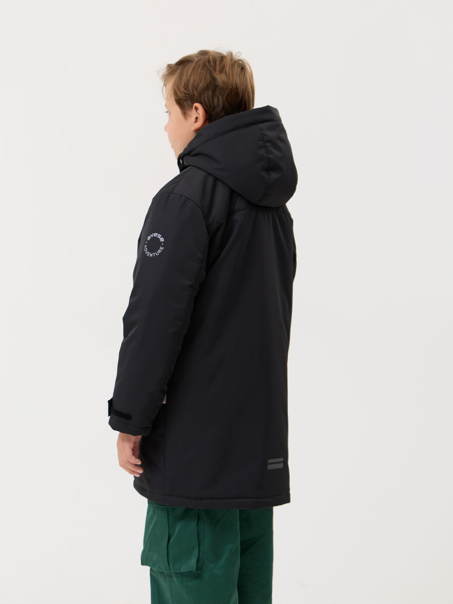 Демисезонная удлиненная куртка для мальчика, прямого силуэта, с втачным капюшоном. Центральная застёжка на молнию, закрытую центральной планкой на кнопках и липучке. 2 прорезных кармана с клапанами на кнопках. Рукав прямой с патами для регулировки. По лицевому краю капюшона кулиса с люверсами и шнуром для регулировки. Подкладка комбинированная с мехом, с внутренним накладным карманом. На куртке расположены светоотражающие элементы. Рассчитана на температуру от -10 до +5.