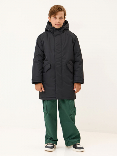 Демисезонная удлиненная куртка для мальчика, прямого силуэта, с втачным капюшоном. Центральная застёжка на молнию, закрытую центральной планкой на кнопках и липучке. 2 прорезных кармана с клапанами на кнопках. Рукав прямой с патами для регулировки. По лицевому краю капюшона кулиса с люверсами и шнуром для регулировки. Подкладка комбинированная с мехом, с внутренним накладным карманом. На куртке расположены светоотражающие элементы. Рассчитана на температуру от -10 до +5.