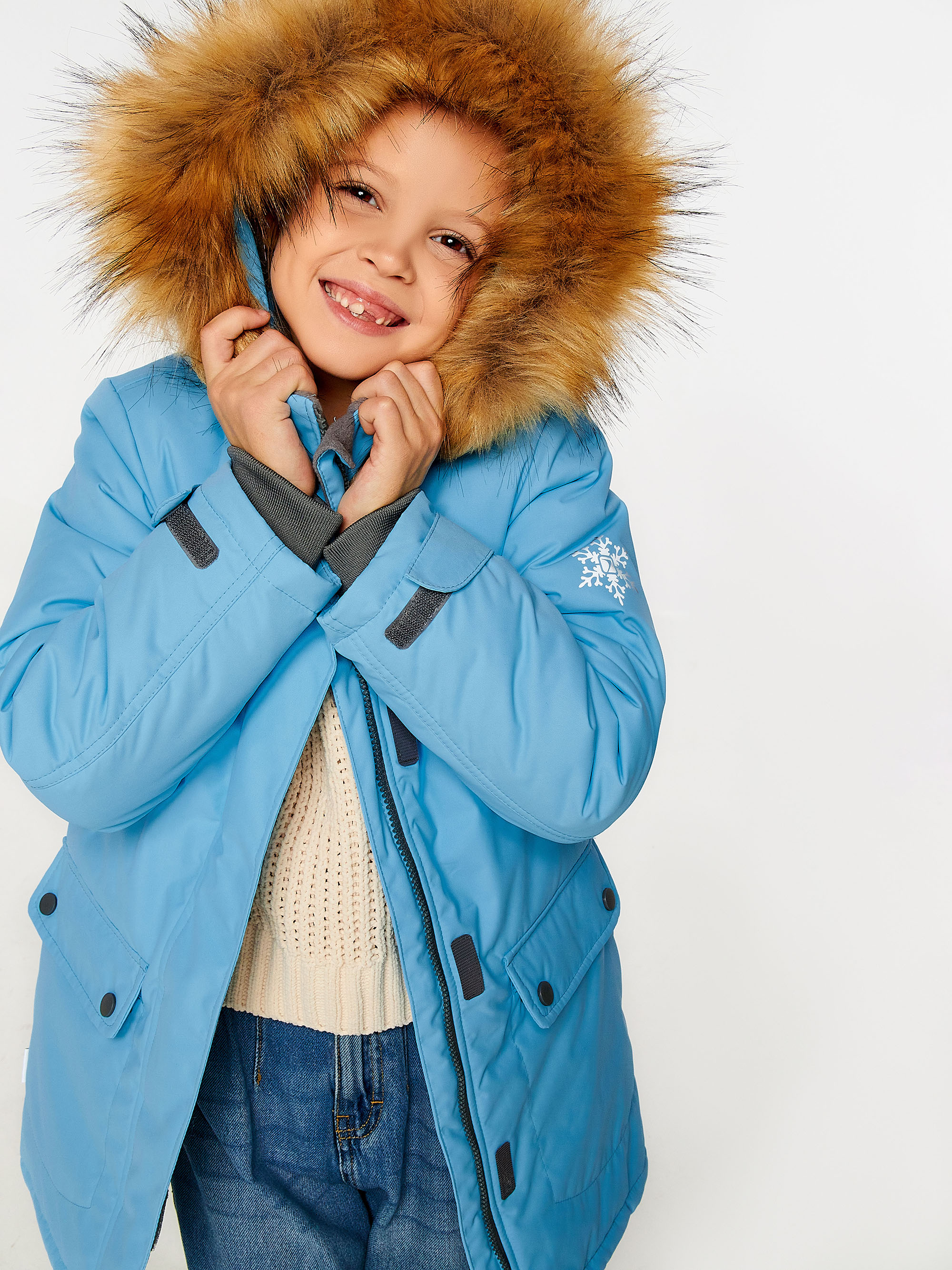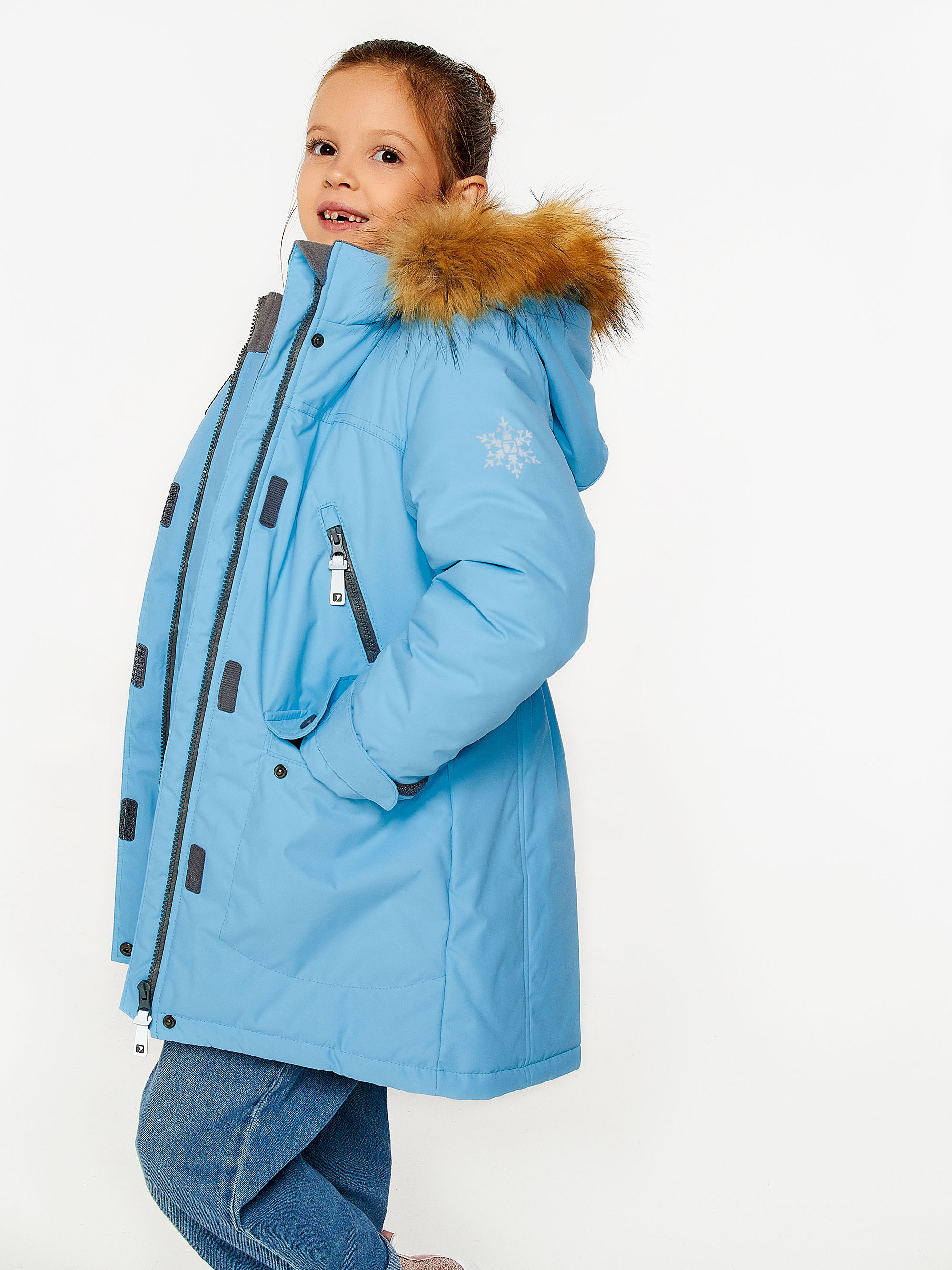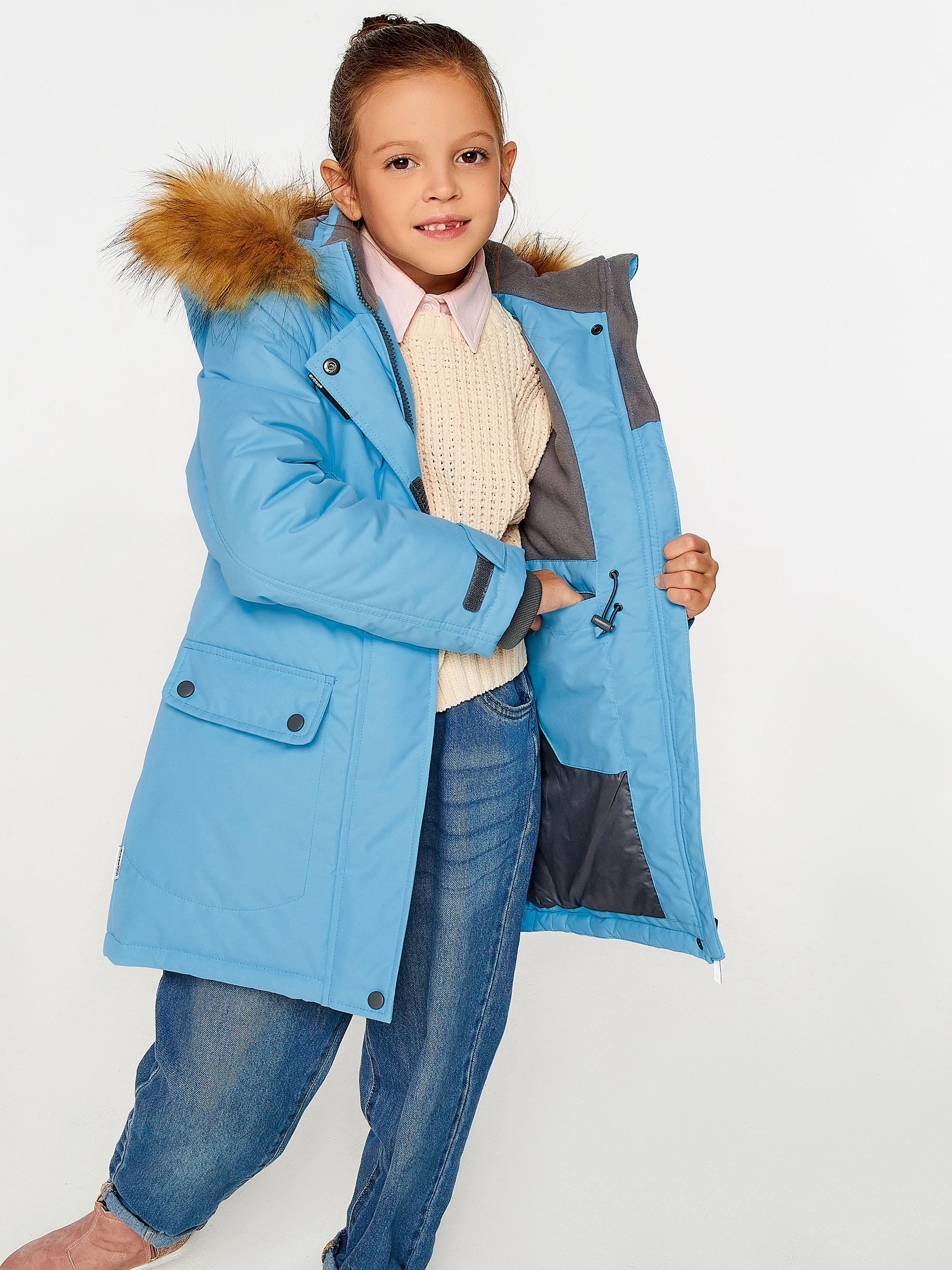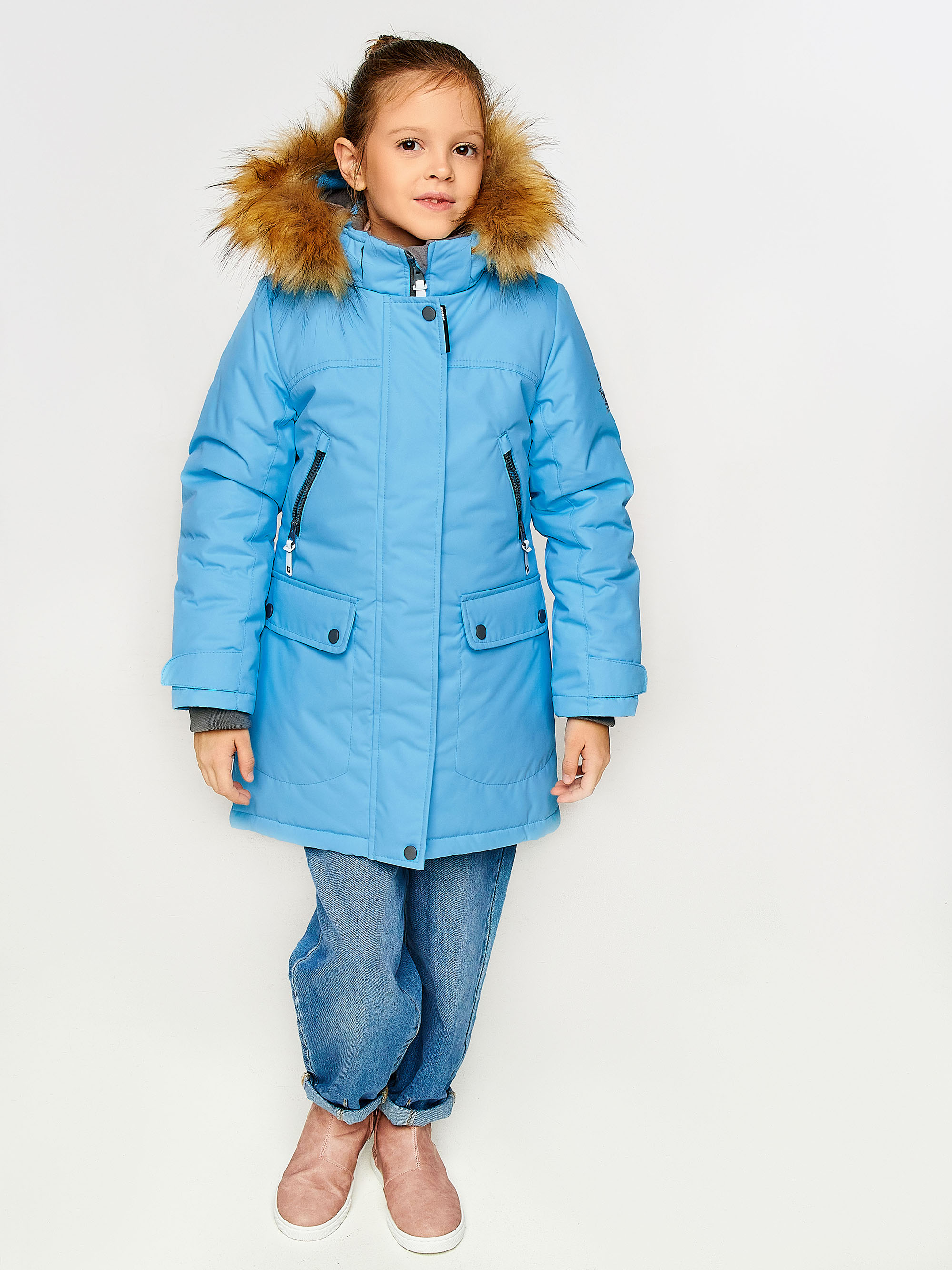 Зимнее пальто прямого силуэта для девочки. Застёжка на молнию закрыта планкой на кнопках и липучках. Подкладка комбинированная из флиса и шелка. Отстёгивающийся капюшон с подкладкой из флиса. К капюшону на молнию и кнопки пристегивается опушка из искусственного меха (енот). 4 передних кармана различной конфигурации.