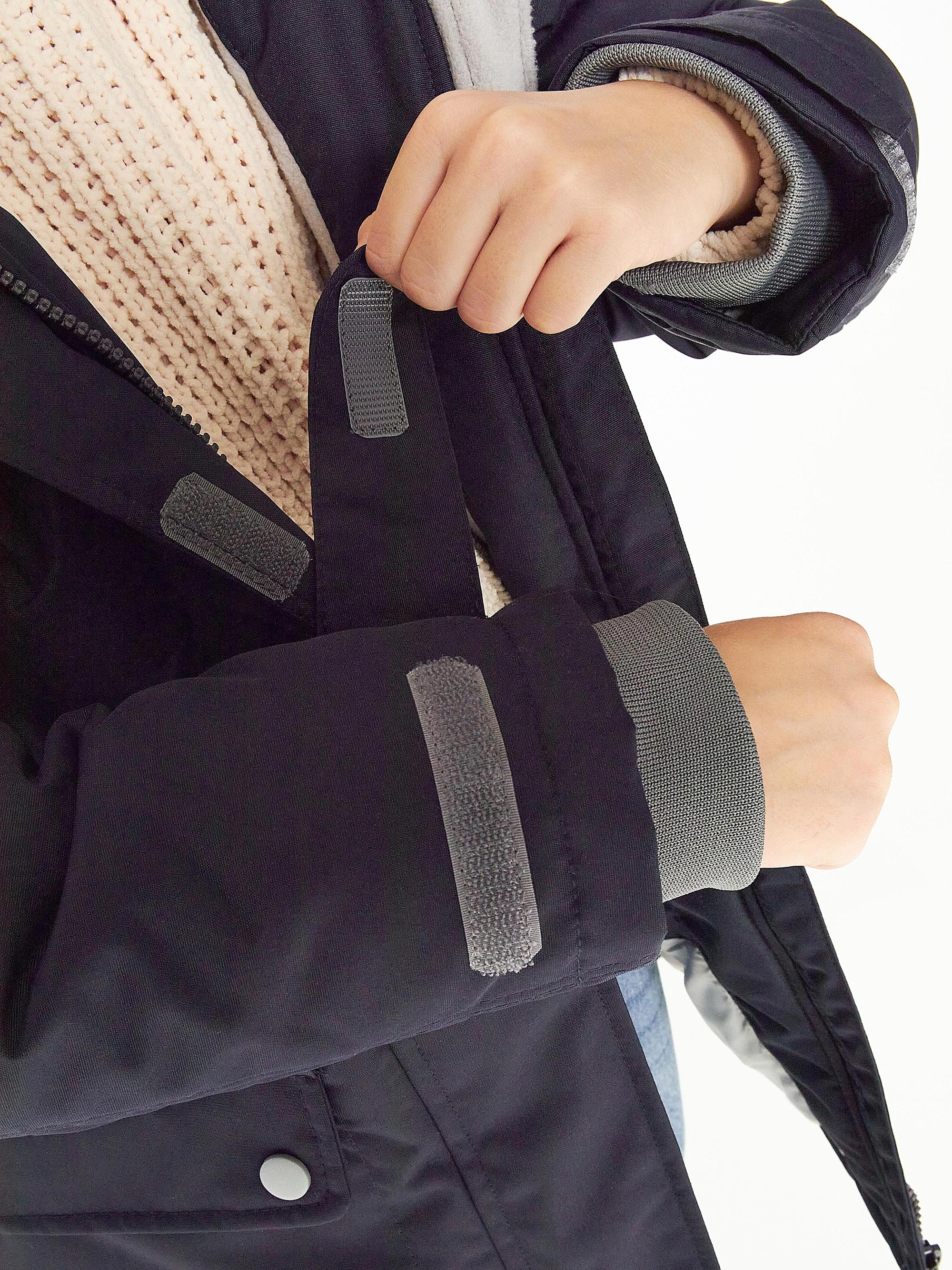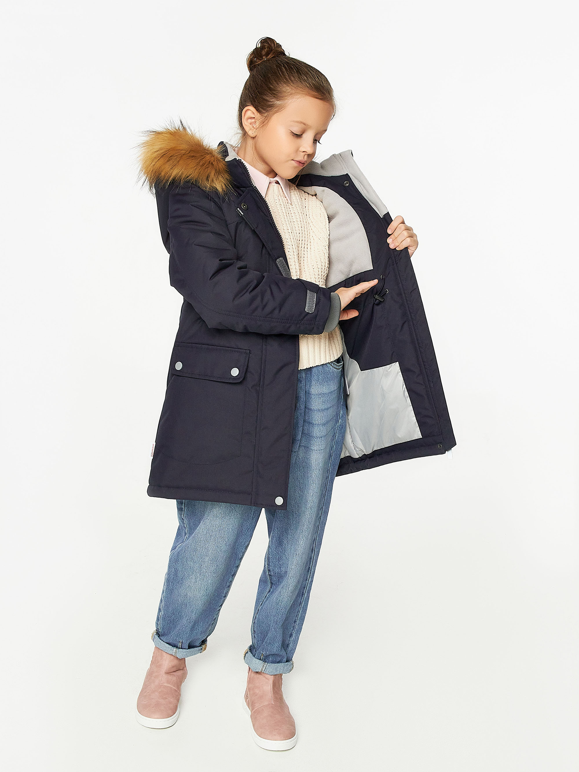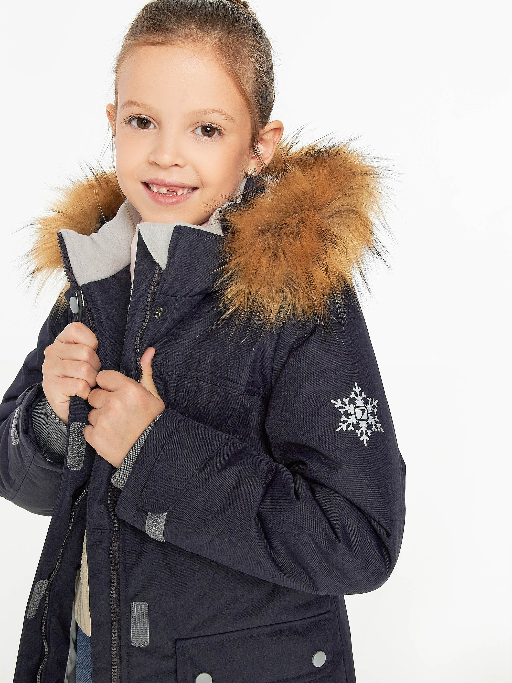 Зимнее пальто прямого силуэта для девочки. Застёжка на молнию закрыта планкой на кнопках и липучках. Подкладка комбинированная из флиса и шелка. Отстёгивающийся капюшон с подкладкой из флиса. К капюшону на молнию и кнопки пристегивается опушка из искусственного меха (енот). 4 передних кармана различной конфигурации.