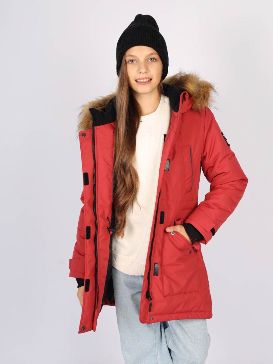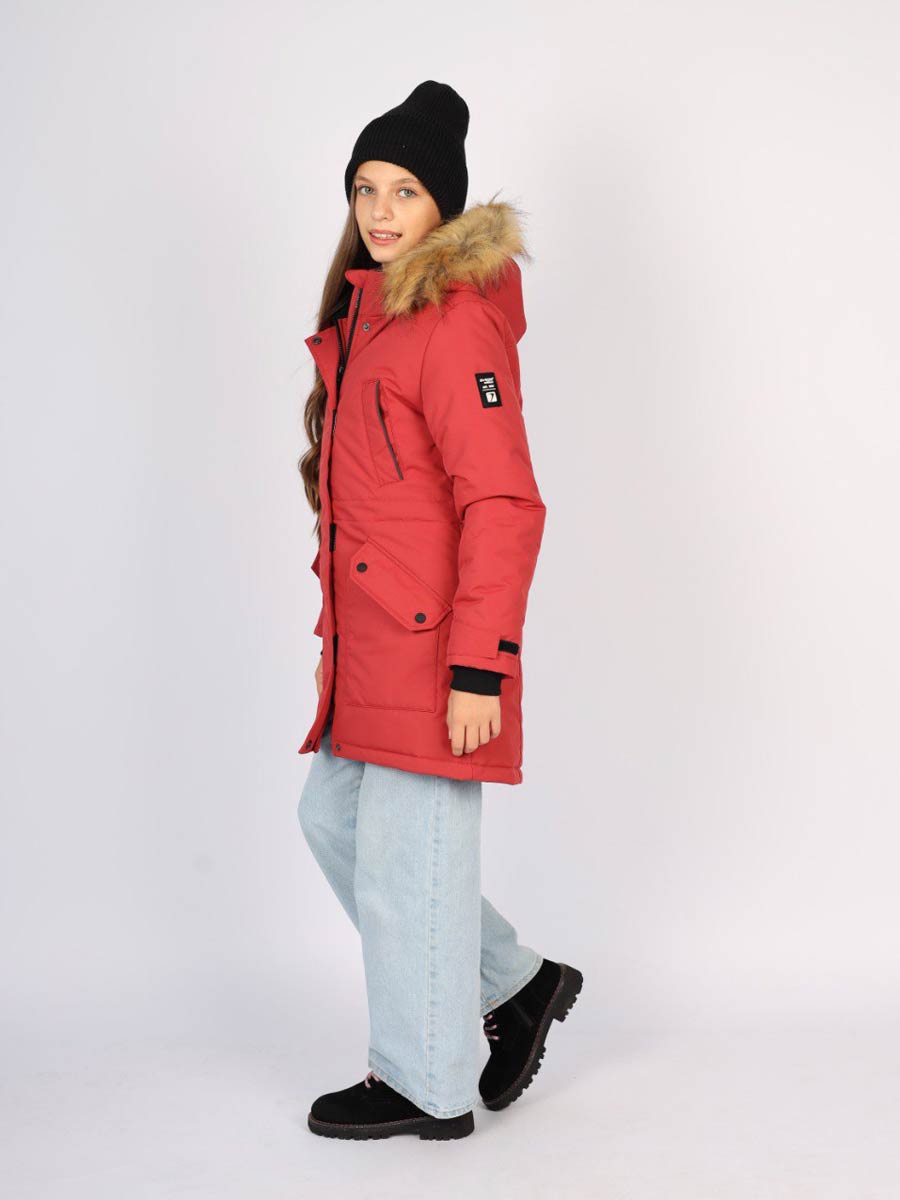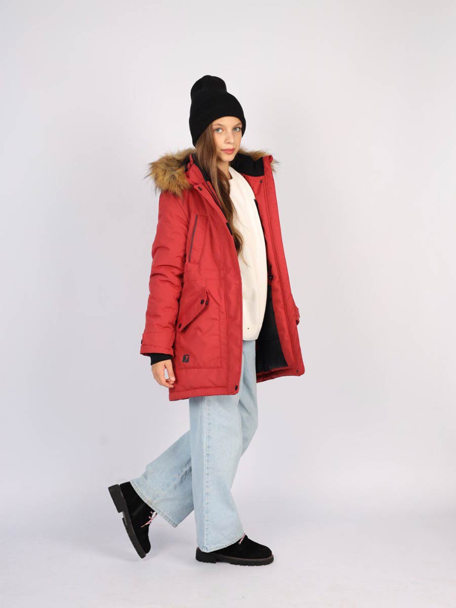 Удлиненная зимняя куртка для девушки прямого силуэта из влагостойкой, дышащей ткани. Отстегивающийся капюшон со съёмной опушкой из искусственного меха. Подкладка из флиса и шелка с внутренним карманом на молнии. Центральная молния закрыта планкой на кнопках и липучках. 2 верхних кармана на магнитных кнопках. 2 нижних накладных кармана с клапаном на кнопках. На куртке располагаются светоотражающие элементы. Рассчитана на температуру от -10 до -25.