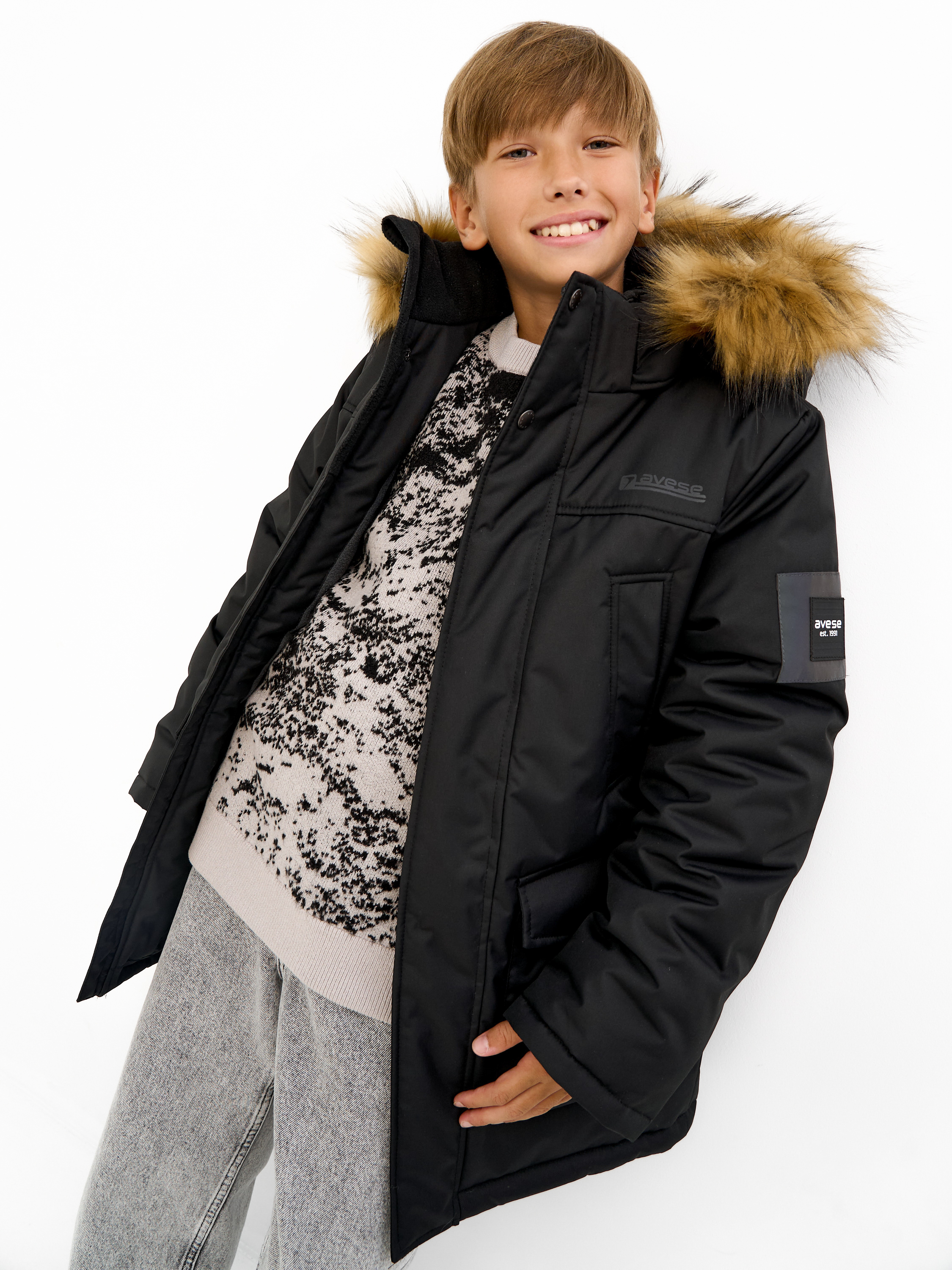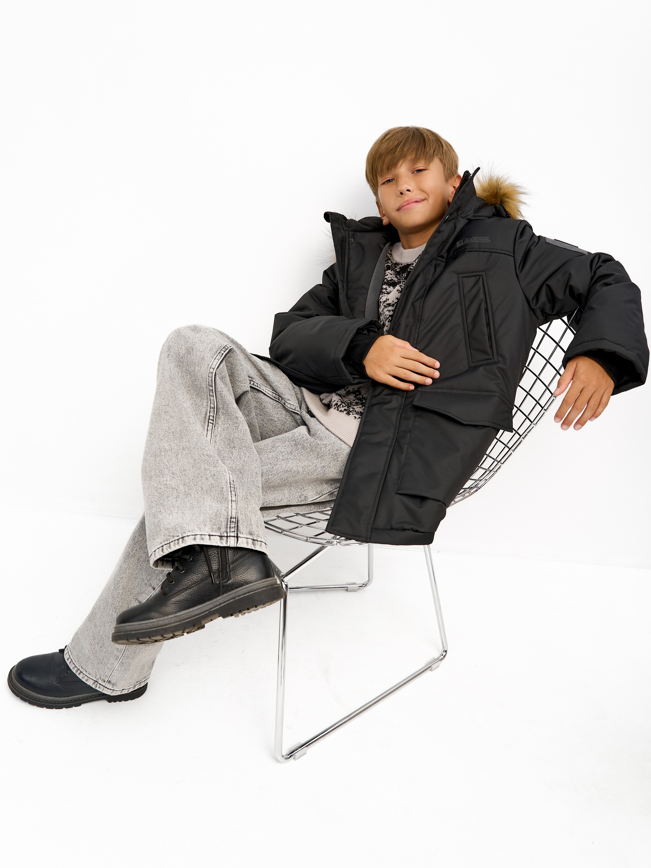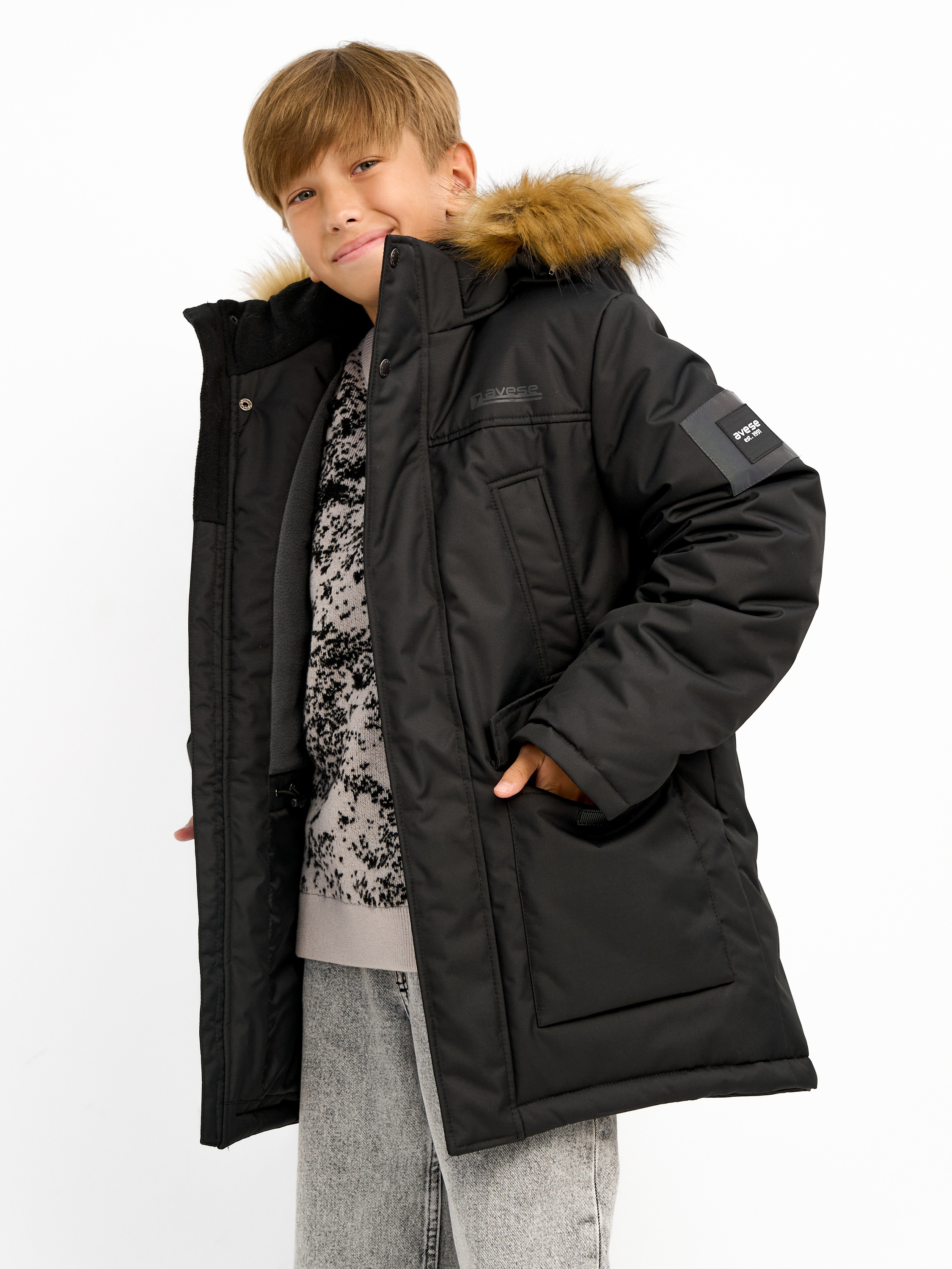 Удлиненная зимняя куртка для мальчиков из влагостойкой, дышащей ткани. Застёжка на молнию, закрытая планкой на кнопках и липучках. Съёмный капюшон с отстёгивающейся опушкой из искусственного меха. Подкладка комбинированная из флиса и шелка с внутренним карманом. 4 наружных кармана различной конфигурации. На куртке располагаются светоотражающие элементы. Рассчитана на температуру от -10 до -25.