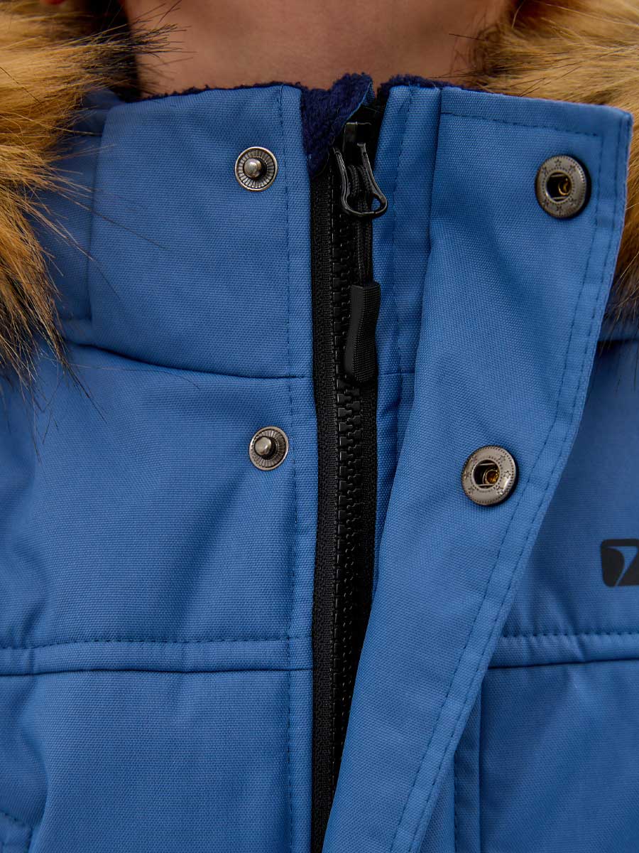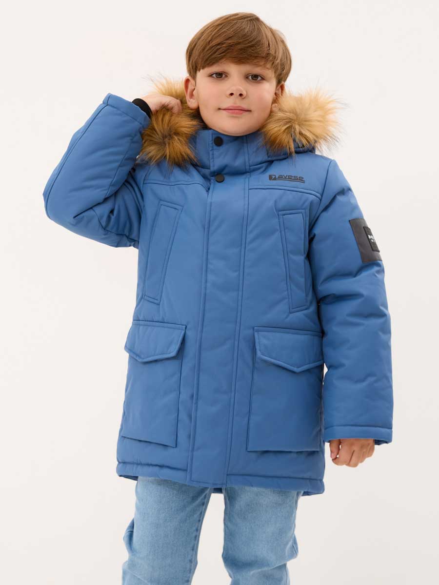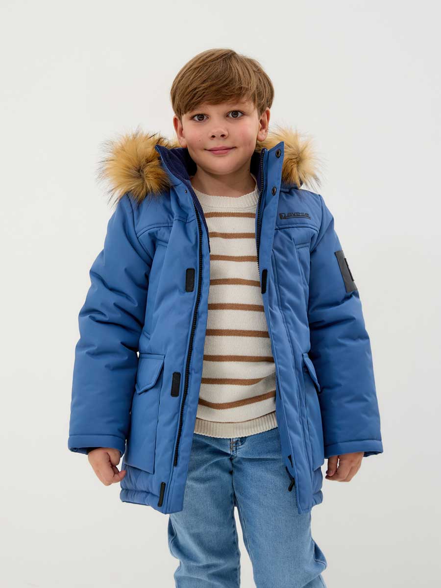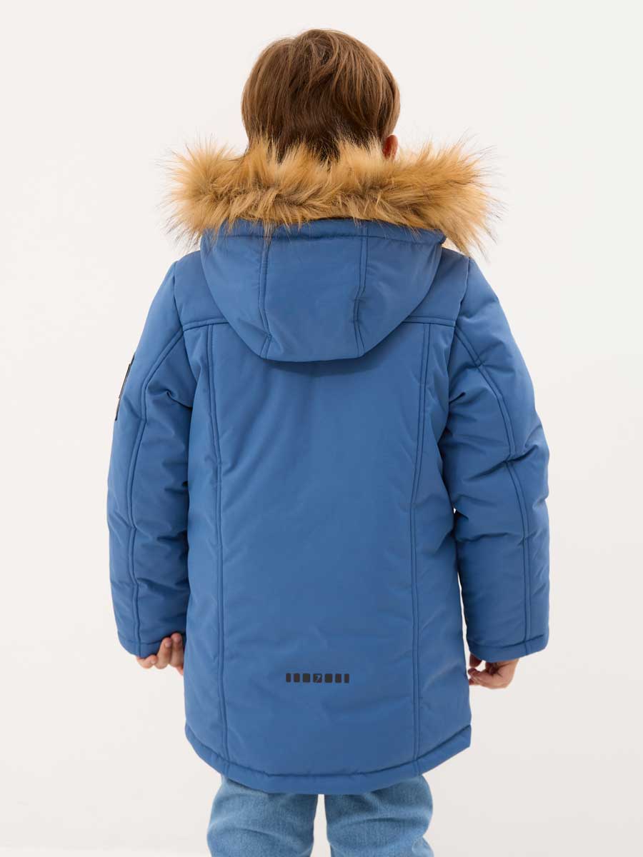 Удлиненная зимняя куртка для мальчиков из влагостойкой, дышащей ткани. Застёжка на молнию, закрытая планкой на кнопках и липучках. Съёмный капюшон с отстёгивающейся опушкой из искусственного меха. Подкладка комбинированная из флиса и шелка с внутренним карманом. 4 наружных кармана различной конфигурации. На куртке располагаются светоотражающие элементы. Рассчитана на температуру от -10 до -25.