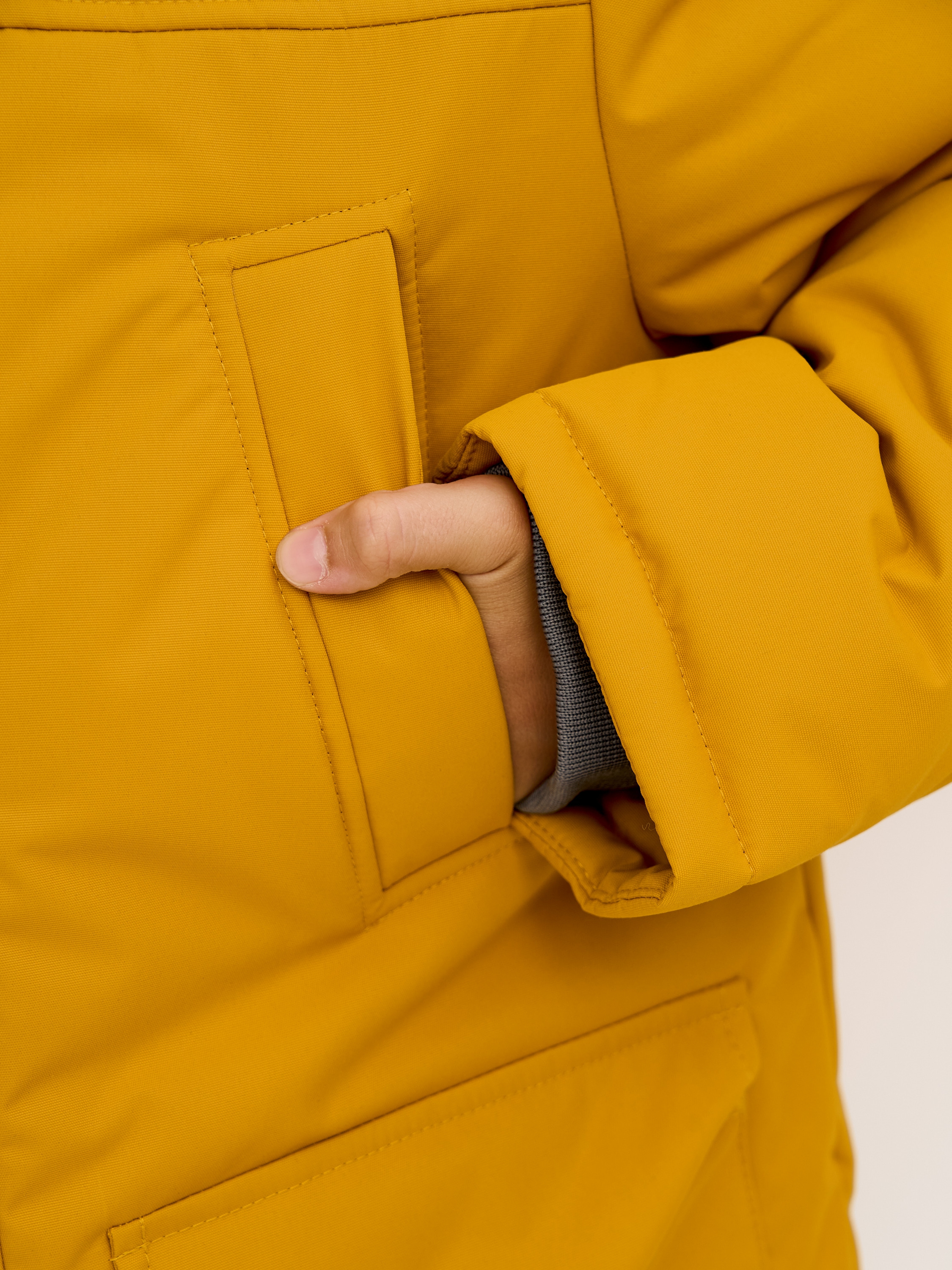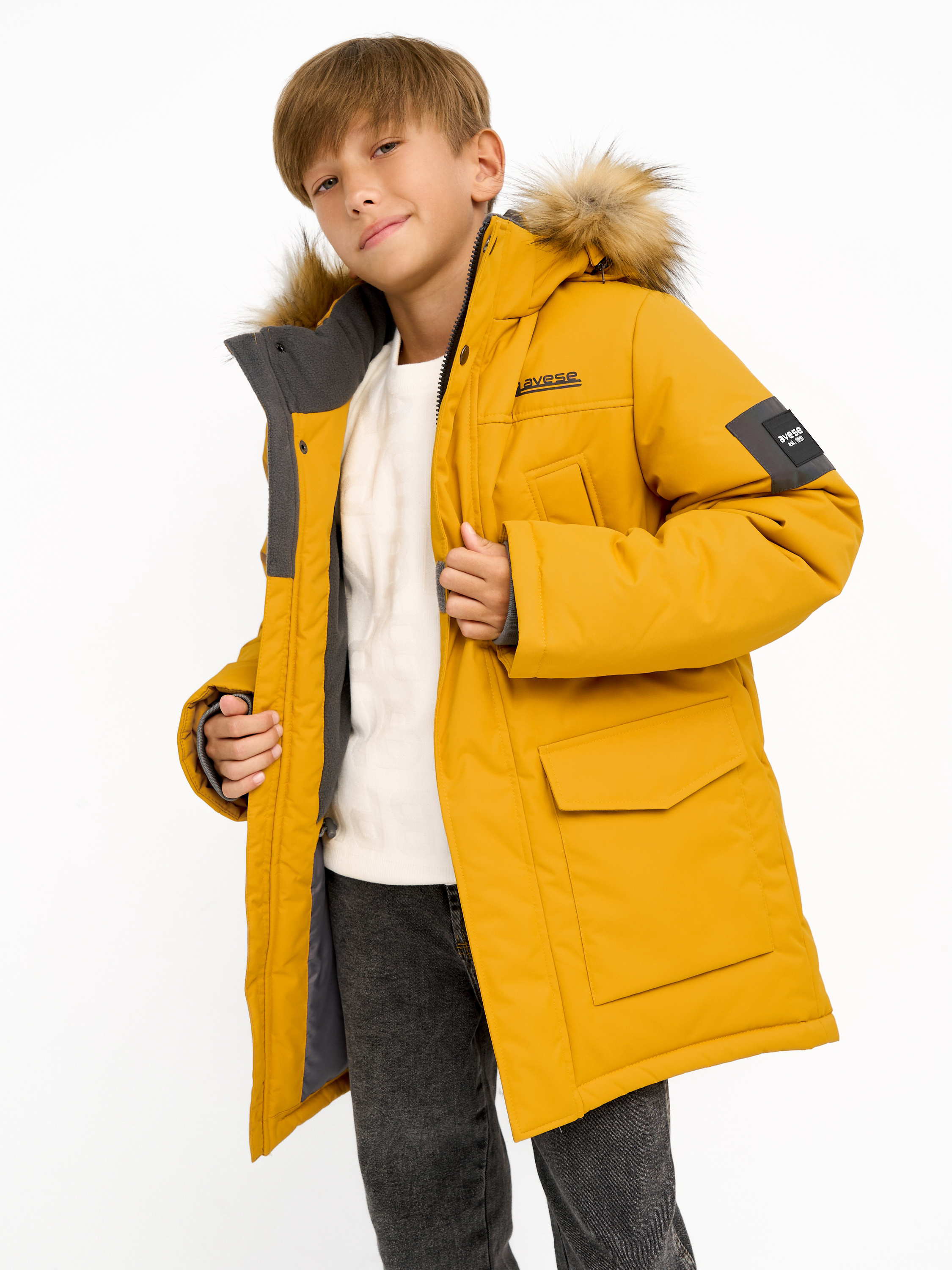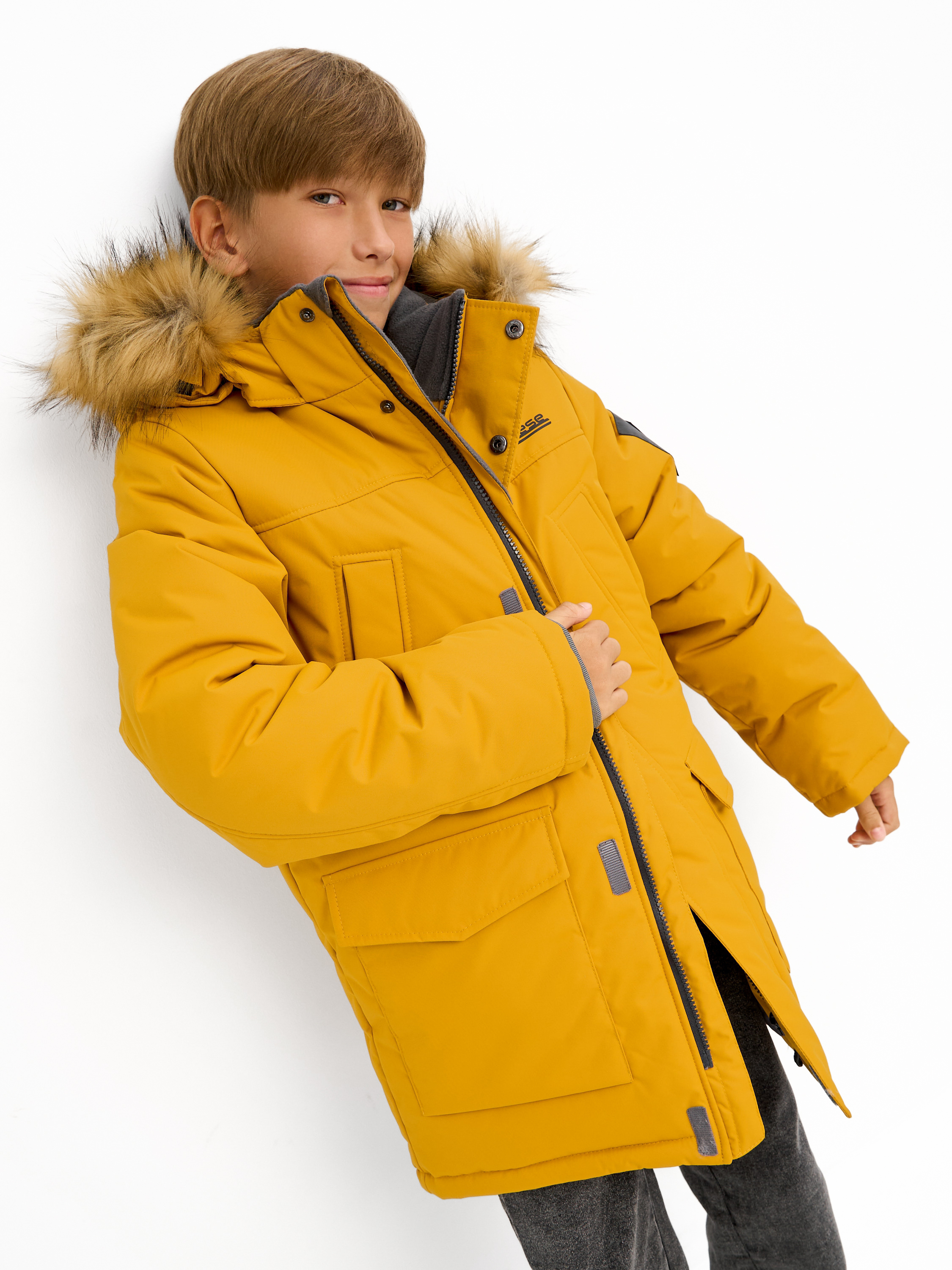 Удлиненная зимняя куртка для мальчиков из влагостойкой, дышащей ткани. Застёжка на молнию, закрытая планкой на кнопках и липучках. Съёмный капюшон с отстёгивающейся опушкой из искусственного меха. Подкладка комбинированная из флиса и шелка с внутренним карманом. 4 наружных кармана различной конфигурации. На куртке располагаются светоотражающие элементы. Рассчитана на температуру от -10 до -25.