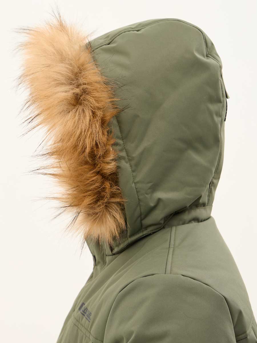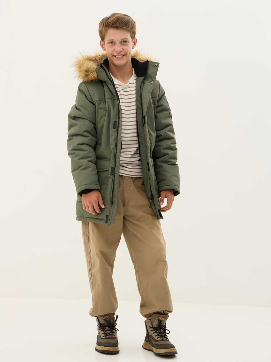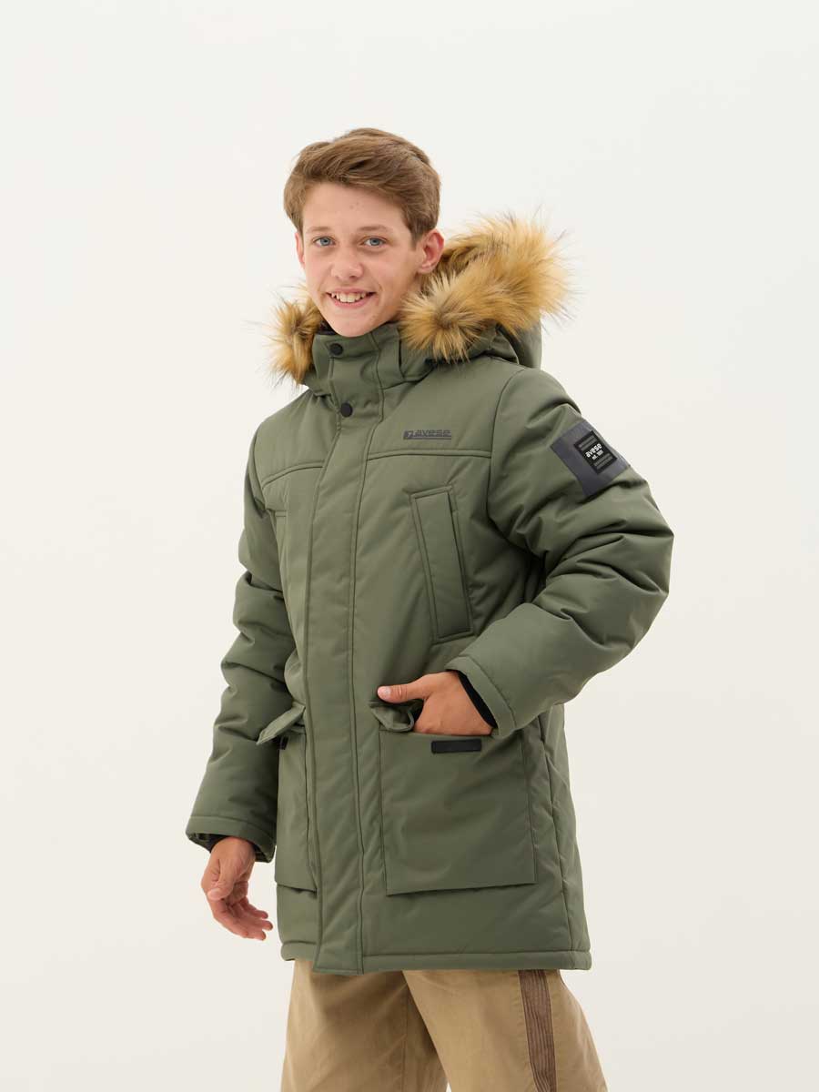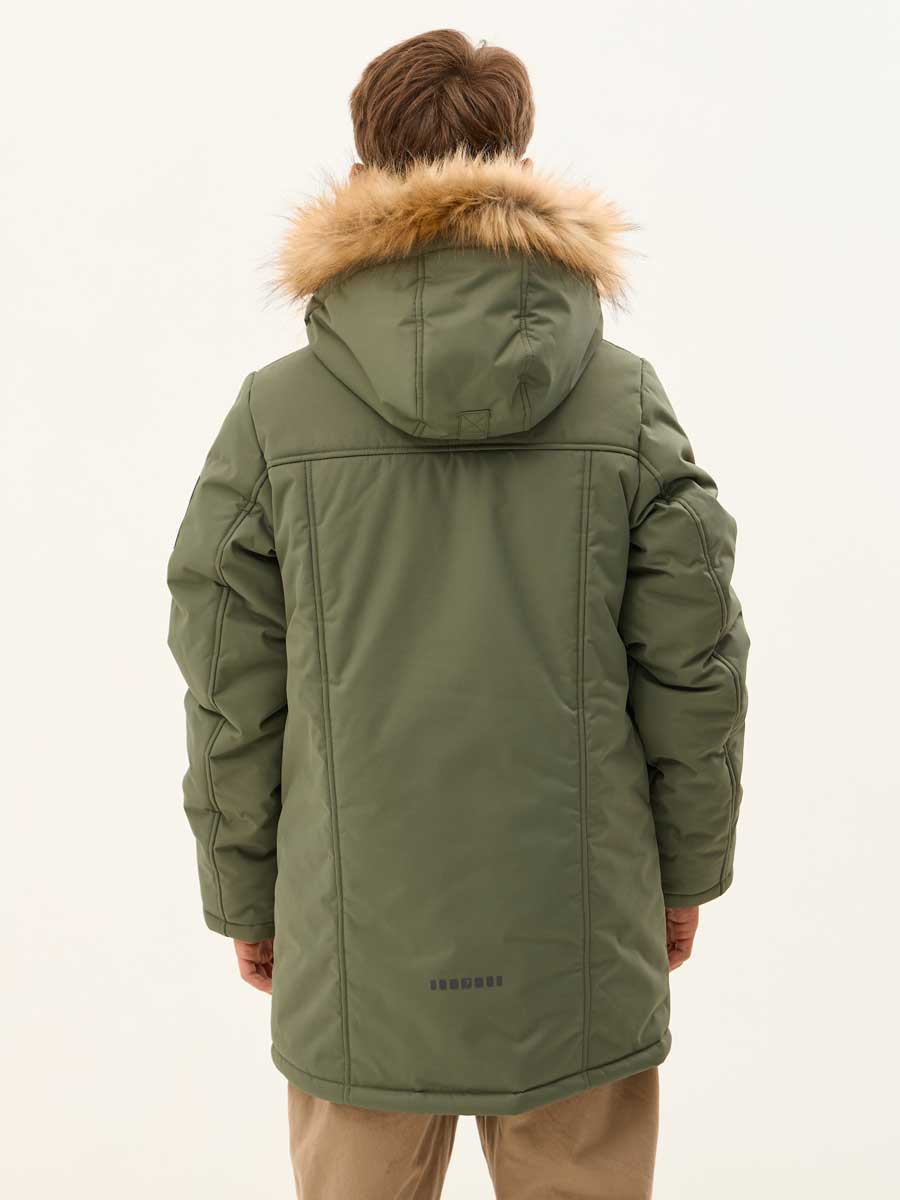 Удлиненная зимняя куртка для мальчиков из влагостойкой, дышащей ткани. Застёжка на молнию, закрытая планкой на кнопках и липучках. Съёмный капюшон с отстёгивающейся опушкой из искусственного меха. Подкладка комбинированная из флиса и шелка с внутренним карманом. 4 наружных кармана различной конфигурации. На куртке располагаются светоотражающие элементы. Рассчитана на температуру от -10 до -25.