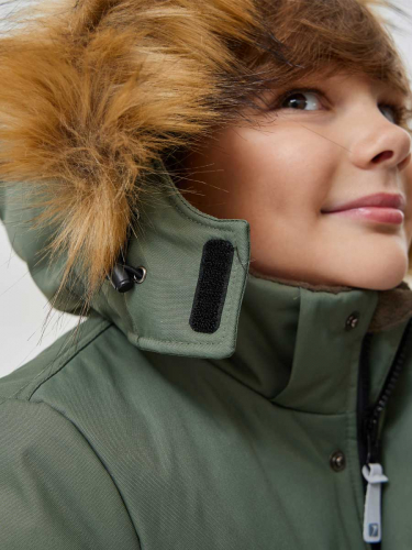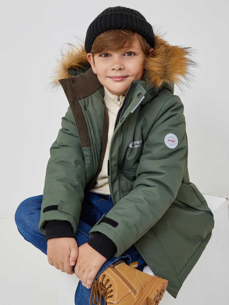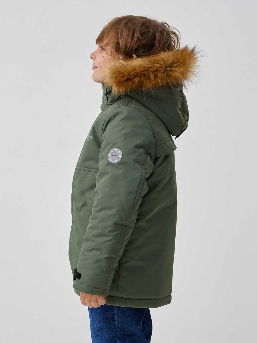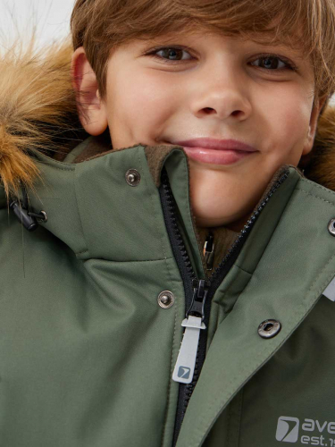 Куртка для детей из влагостойкой, дышащей ткани. Застёжка-молния закрыта планкой на липучках и кнопках. Подкладка комбинированная из флиса и шелка, на подкладке нашивка с именем. Съемный капюшон с отстёгивающейся опушкой из искусственного меха. Низ куртки и капюшон регулируются резиновым шнуром и фиксаторами. 2 передних кармана с молниями. На куртке располагаются светоотражающие элементы. Рассчитана на температуру от -10 до -25.