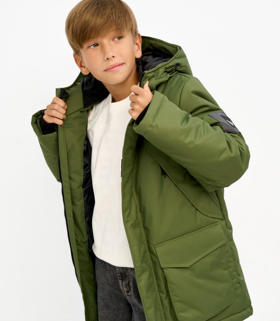 Удлиненная зимняя куртка для мальчиков из влагостойкой, дышащей ткани. Застёжка на молнию, закрытая планкой на кнопках и липучках. Подкладка комбинированная из флиса и шелка с внутренним карманом. 4 наружных кармана различной конфигурации. На куртке располагаются светоотражающие элементы. Рассчитана на температуру от -10 до -25.