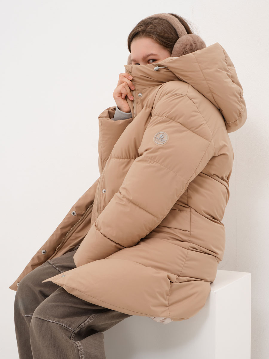 Зимняя удлиненная куртка-пуховик для девочки. Утеплитель - искусственный "лебяжий пух"+био-пух, плотность набивки 200 гр/м2. Прямого силуэта, чуть расклешенная к низу, с втачным капюшоном. Центральная застёжка на молнию, закрытую центральной планкой на кнопках и липучках. Подкладка из шёлка на утеплителе - синтепон 100, с внутренним карманом. 2  кармана с клапанами на магнитах. Внутренний манжет рукава из трикотажа. Рассчитана на температуру от -5 до -20.