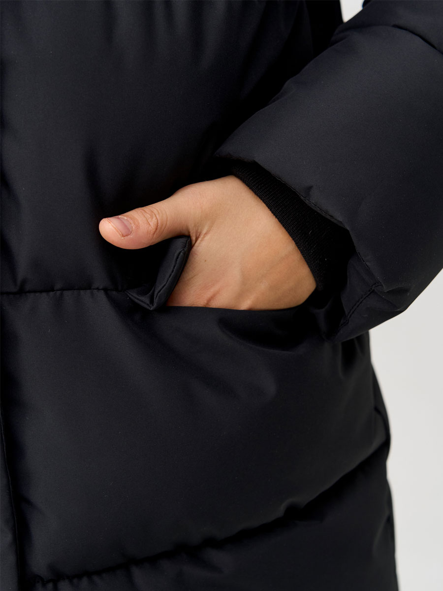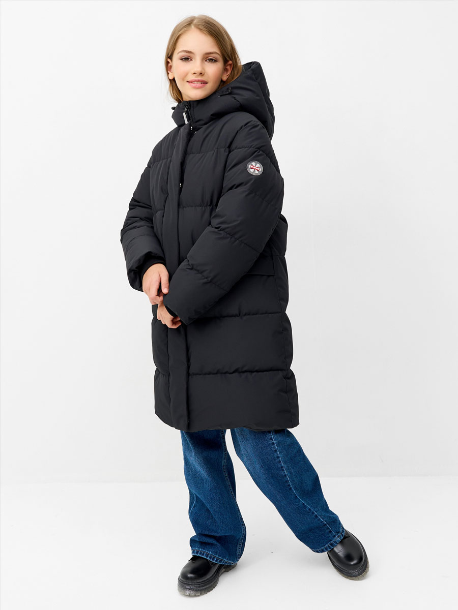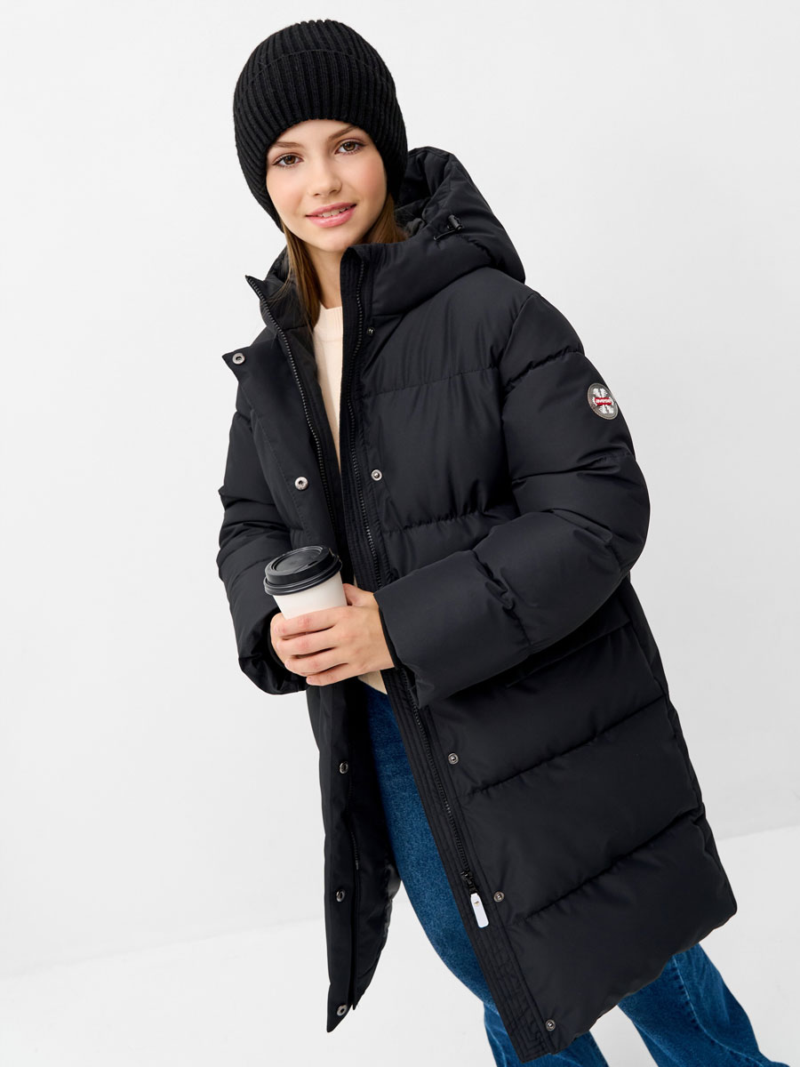 Зимняя удлиненная куртка-пуховик для девочки. Утеплитель - искусственный "лебяжий пух"+био-пух, плотность набивки 200 гр/м2. Прямого силуэта, чуть расклешенная к низу, с втачным капюшоном. Центральная застёжка на молнию, закрытую центральной планкой на кнопках и липучках. Подкладка из шёлка на утеплителе - синтепон 100, с внутренним карманом. 2  кармана с клапанами на магнитах. Внутренний манжет рукава из трикотажа. Рассчитана на температуру от -5 до -20.