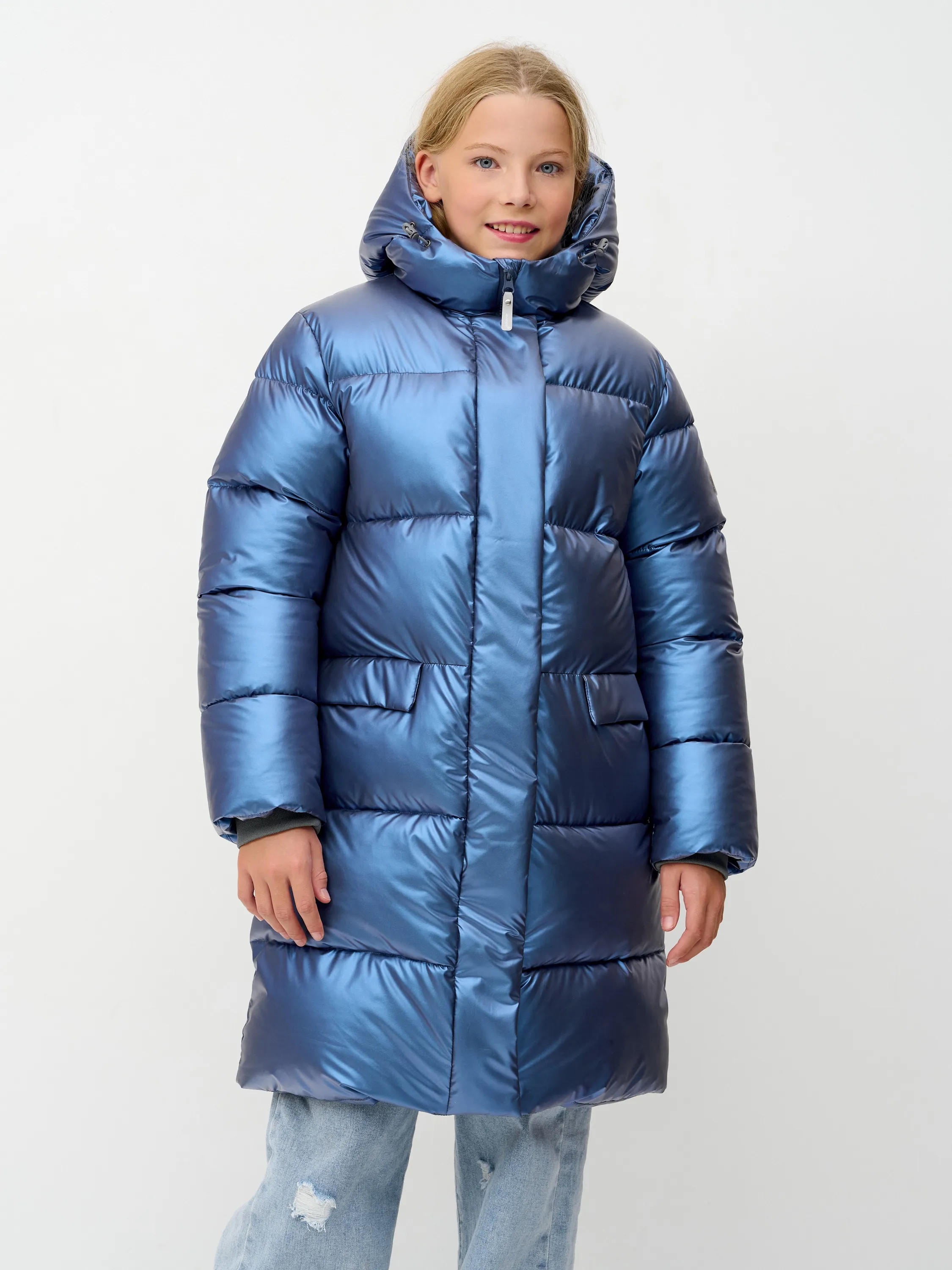 Зимняя удлиненная куртка-пуховик для девочки. Утеплитель - искусственный "лебяжий пух"+био-пух, плотность набивки 200 гр/м2. Прямого силуэта, чуть расклешенная к низу, с втачным капюшоном. Центральная застёжка на молнию, закрытую центральной планкой на кнопках и липучках. Подкладка из шёлка на утеплителе - синтепон 100, с внутренним карманом. 2  кармана с клапанами на магнитах. Внутренний манжет рукава из трикотажа. Рассчитана на температуру от -5 до -20.