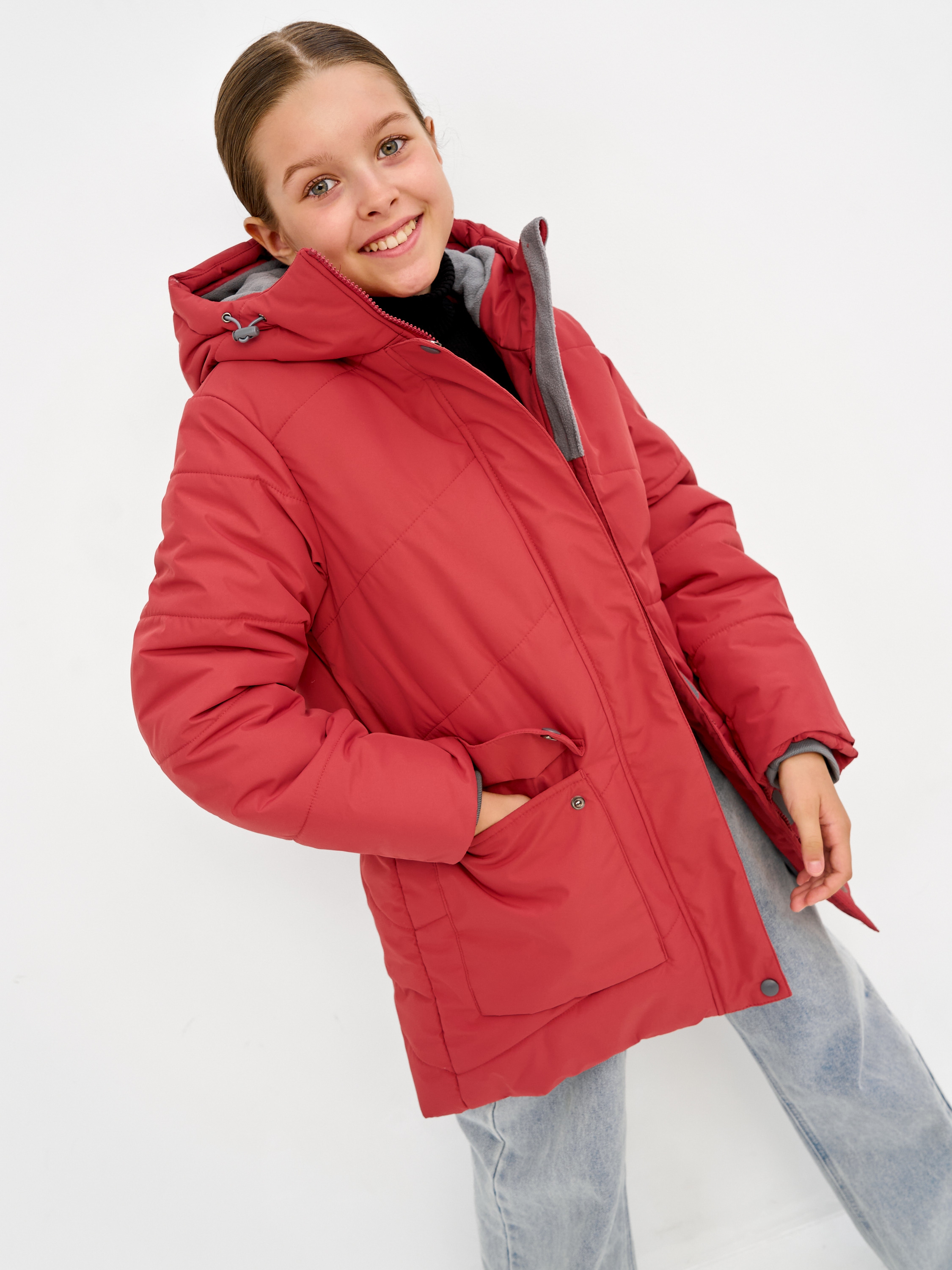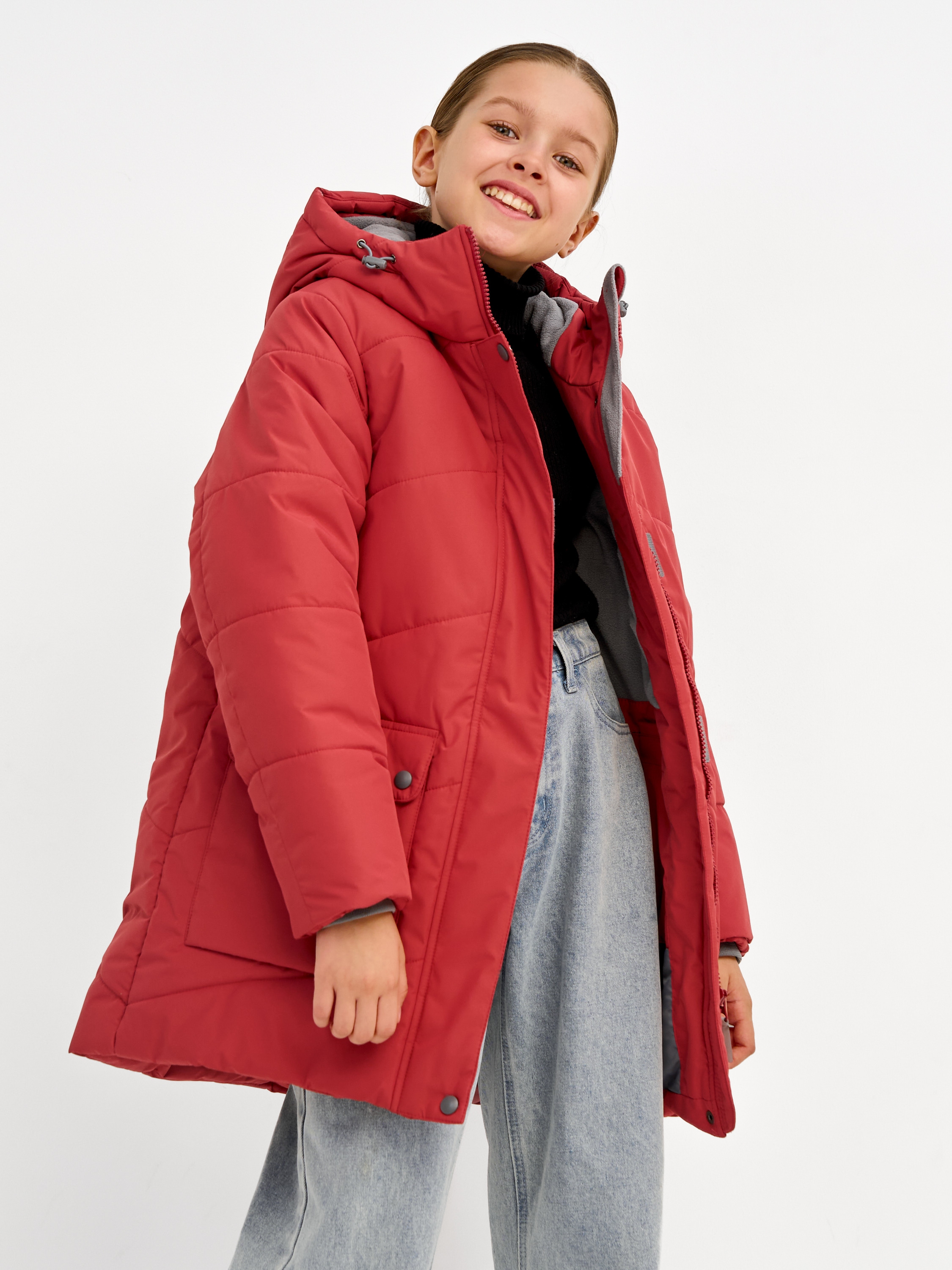 Зимняя удлиненная куртка для девочки. Прямого силуэта, чуть расклешенная к низу, с втачным капюшоном. Центральная застёжка на молнию, закрытую центральной планкой на кнопках и липучках. Подкладка из искусственного шёлка и флиса с внутренним карманом, с утяжкой по талии. 2 нижних накладных кармана с клапанами на кнопках. Внутренний манжет рукава из трикотажа. Рассчитана на температуру от -10 до -25. 100% полиэстер
