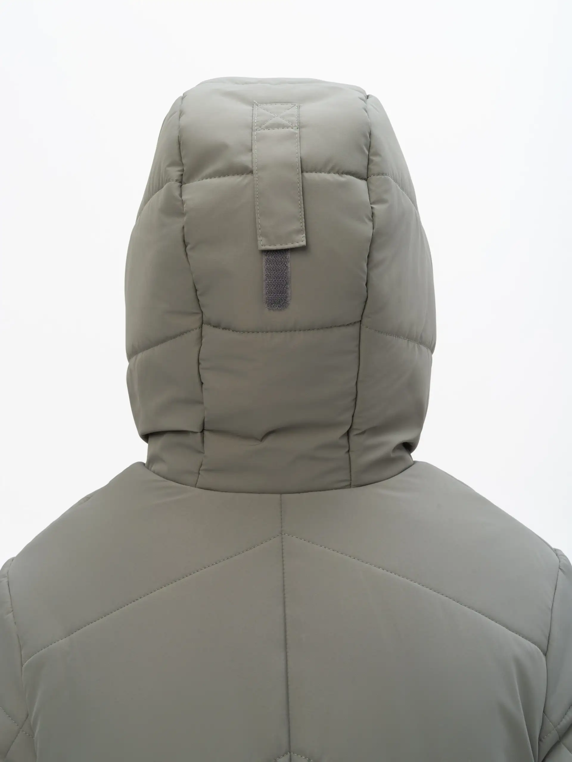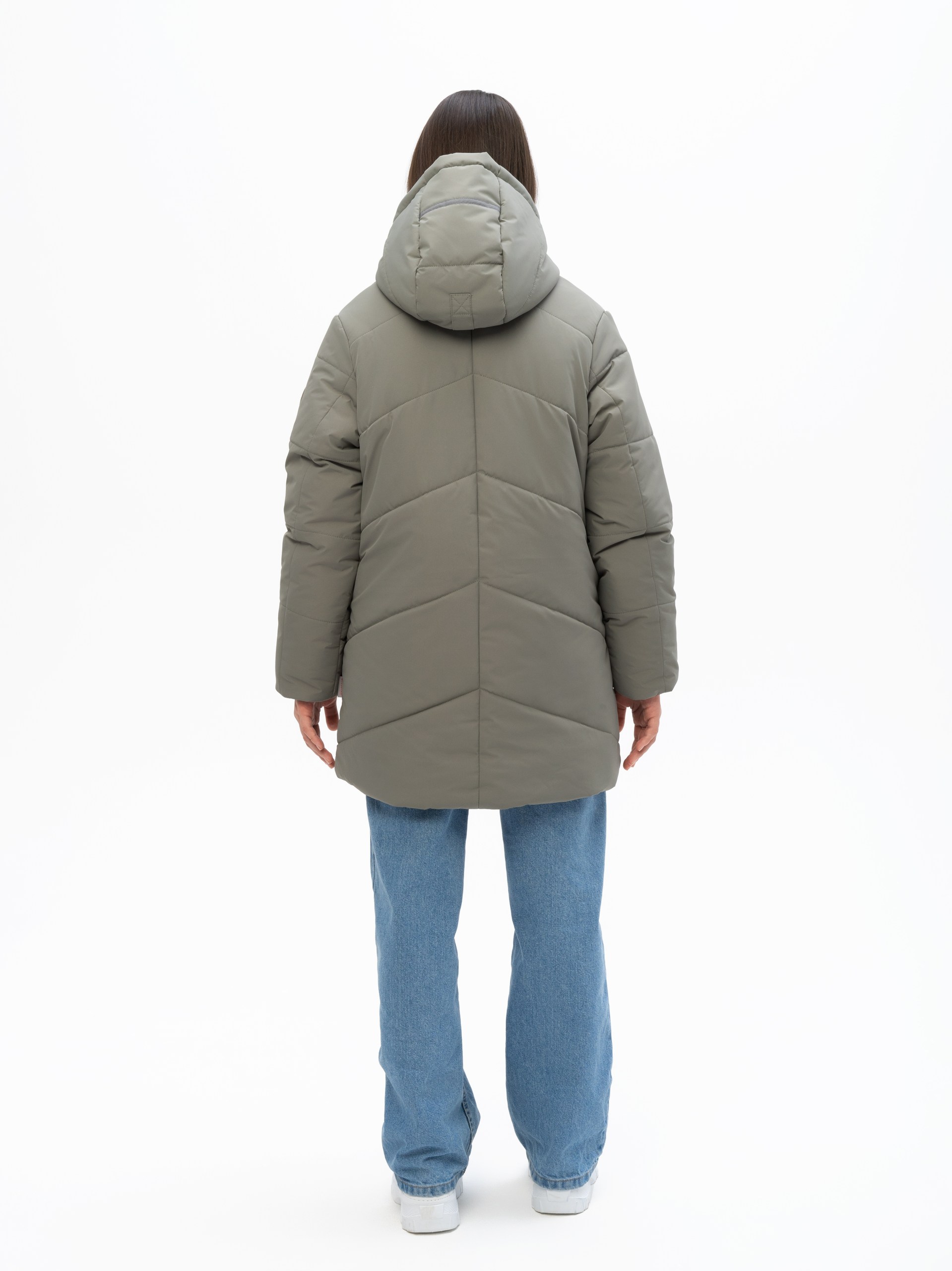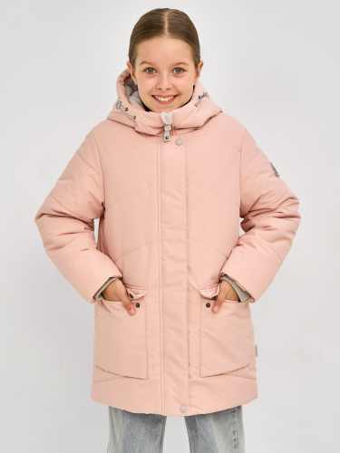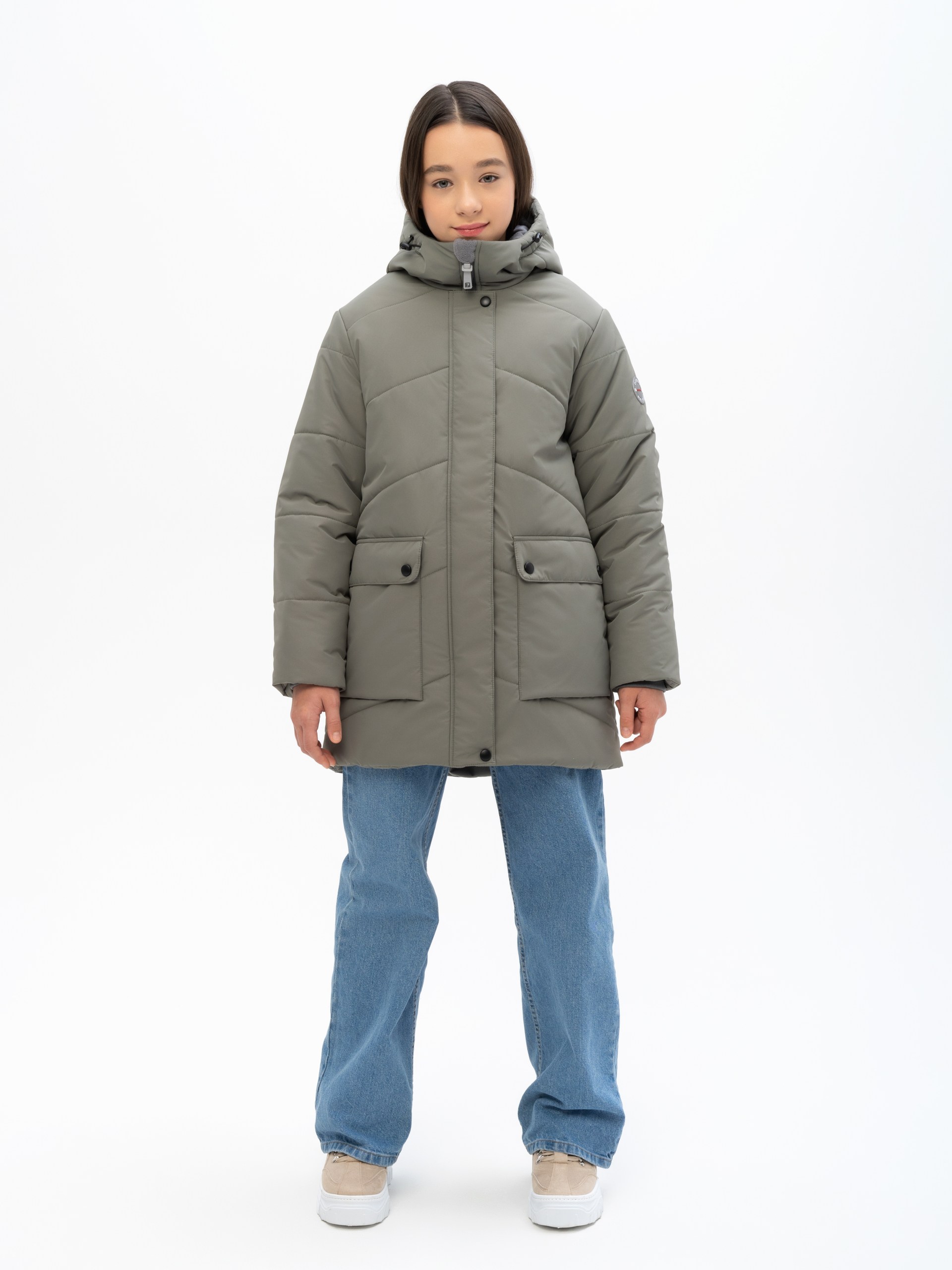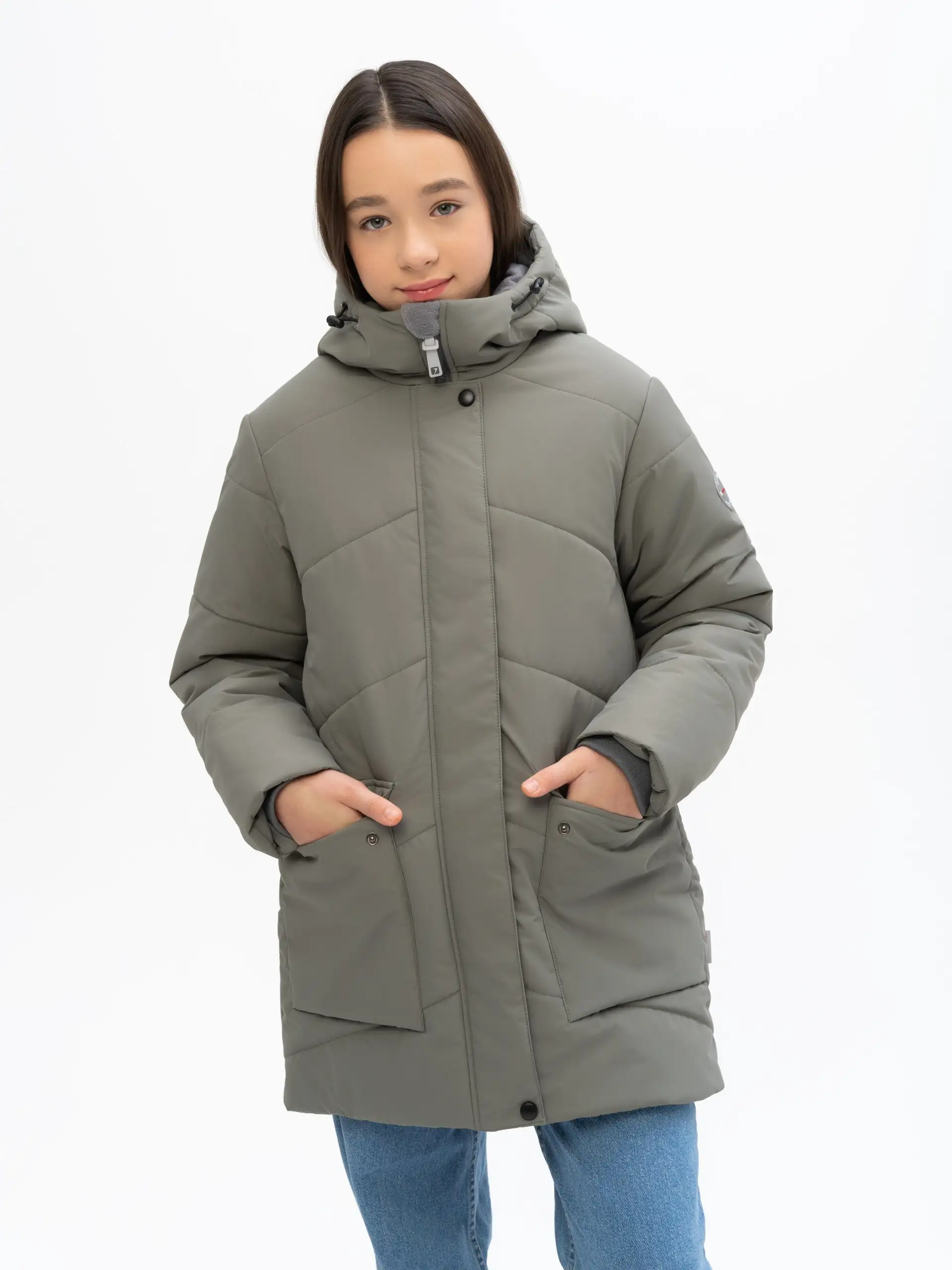 Зимняя удлиненная куртка для девочки. Прямого силуэта, чуть расклешенная к низу, с втачным капюшоном. Центральная застёжка на молнию, закрытую центральной планкой на кнопках и липучках. Подкладка из искусственного шёлка и флиса с внутренним карманом, с утяжкой по талии. 2 нижних накладных кармана с клапанами на кнопках. Внутренний манжет рукава из трикотажа. Рассчитана на температуру от -10 до -25.